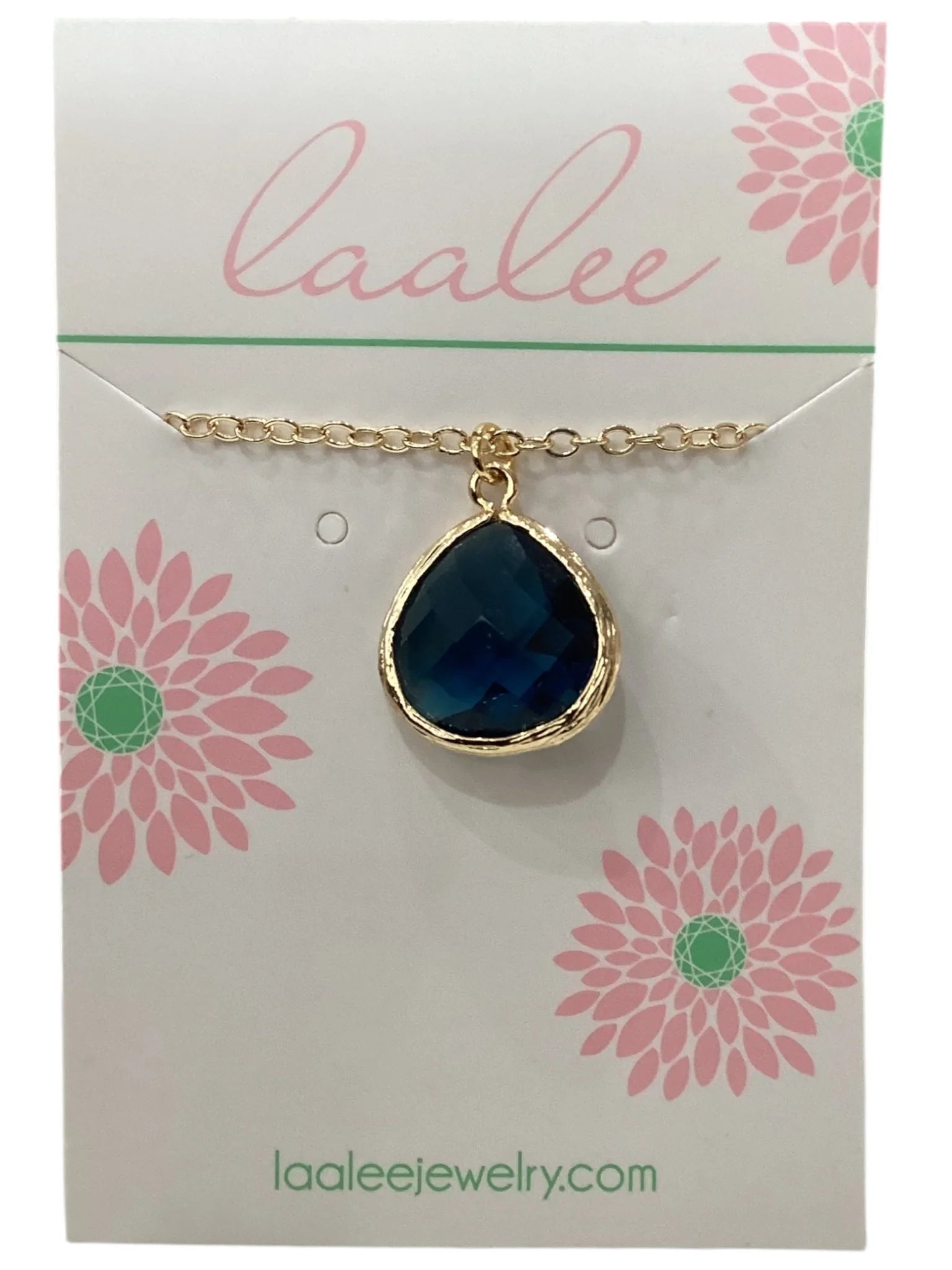 Teardrop necklace with sapphire-blue stone, 14k gold-filled chain