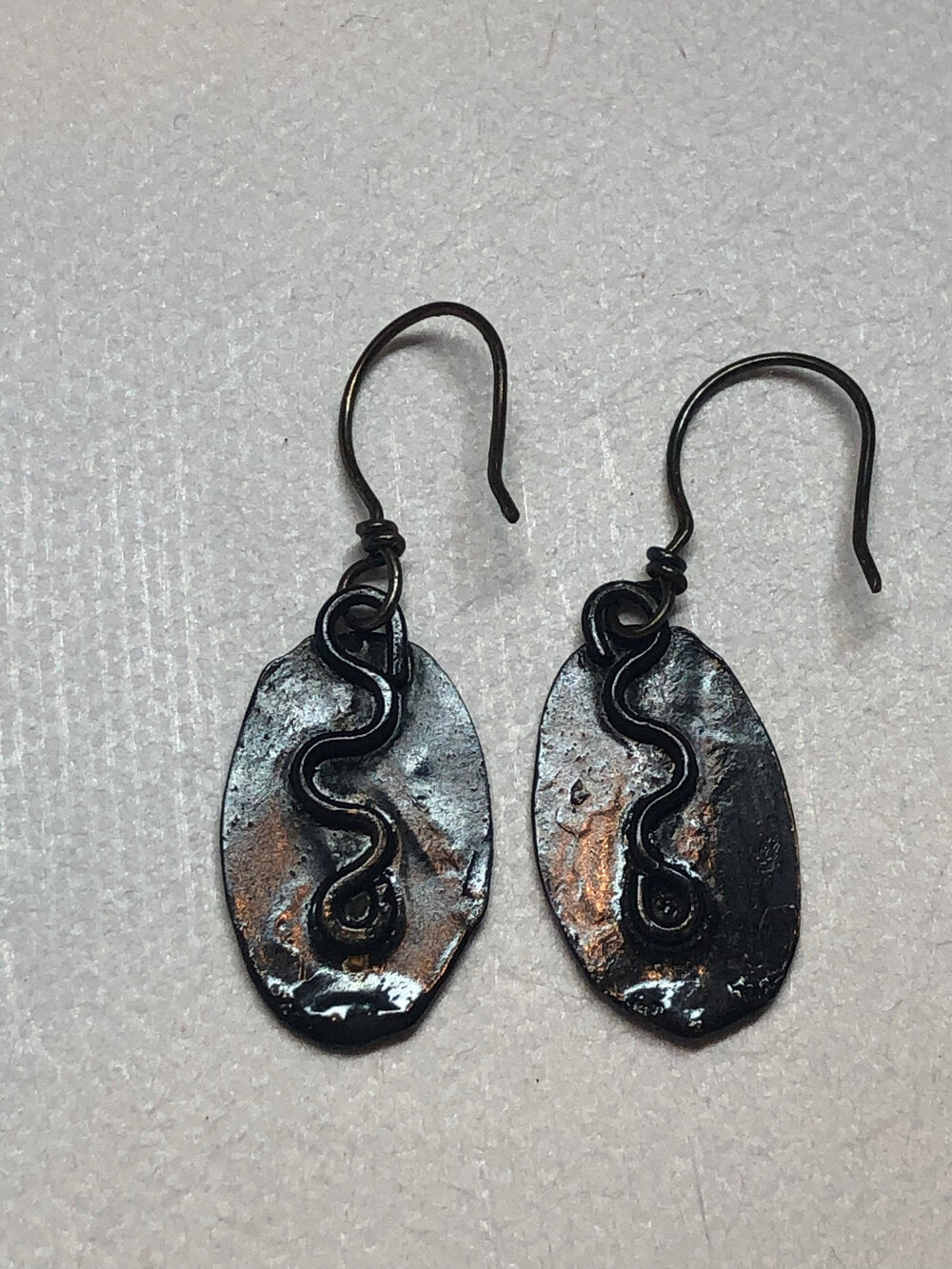The 18 kt gold is really striking on these blackened steel earrings. Very lightweight and the ear wires are sterling silver that’s been darkened.