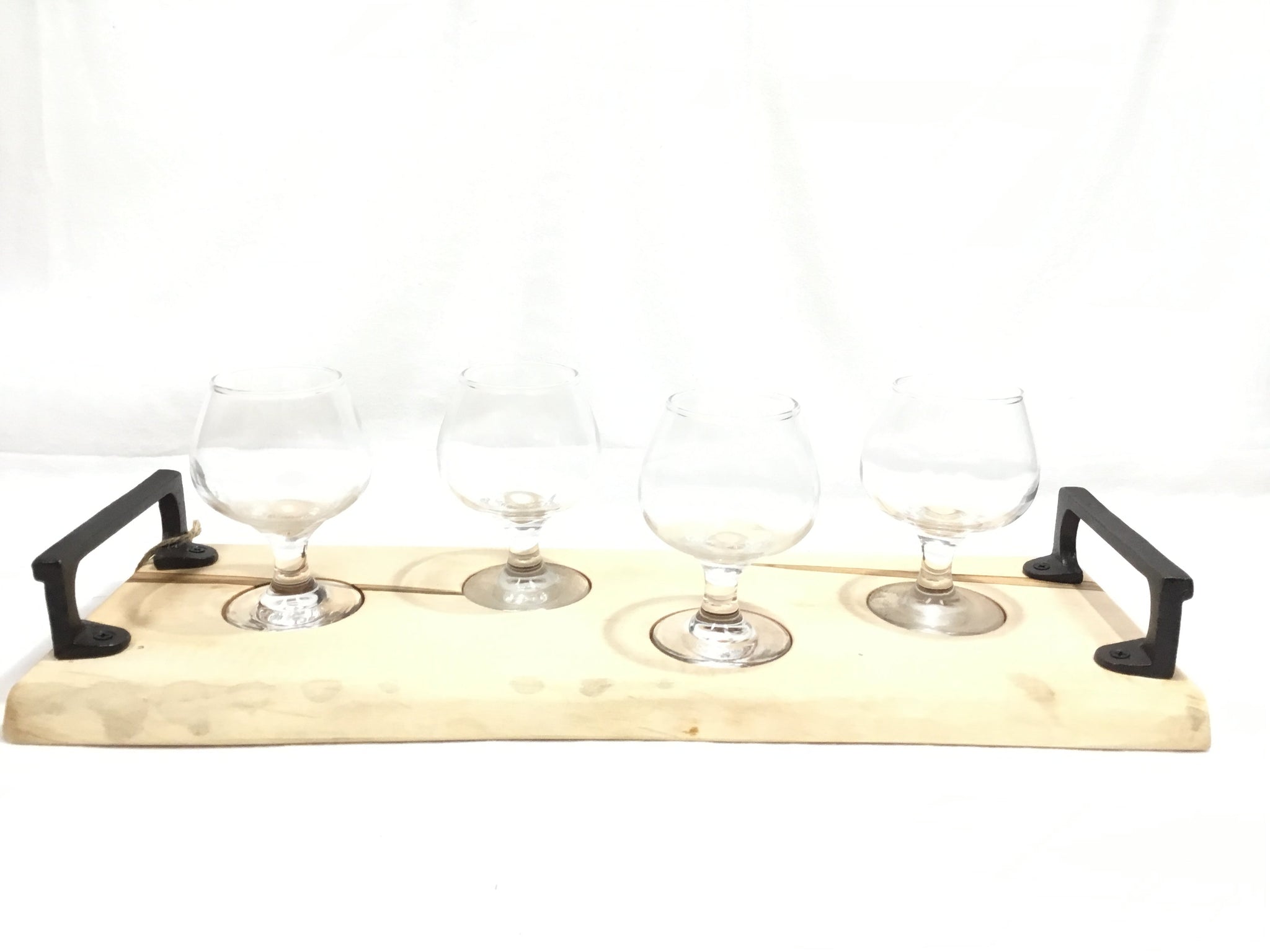 Flight board is 17" long x 7" wide with metal handles and spaces for four glasses. Craft Beer glasses included.