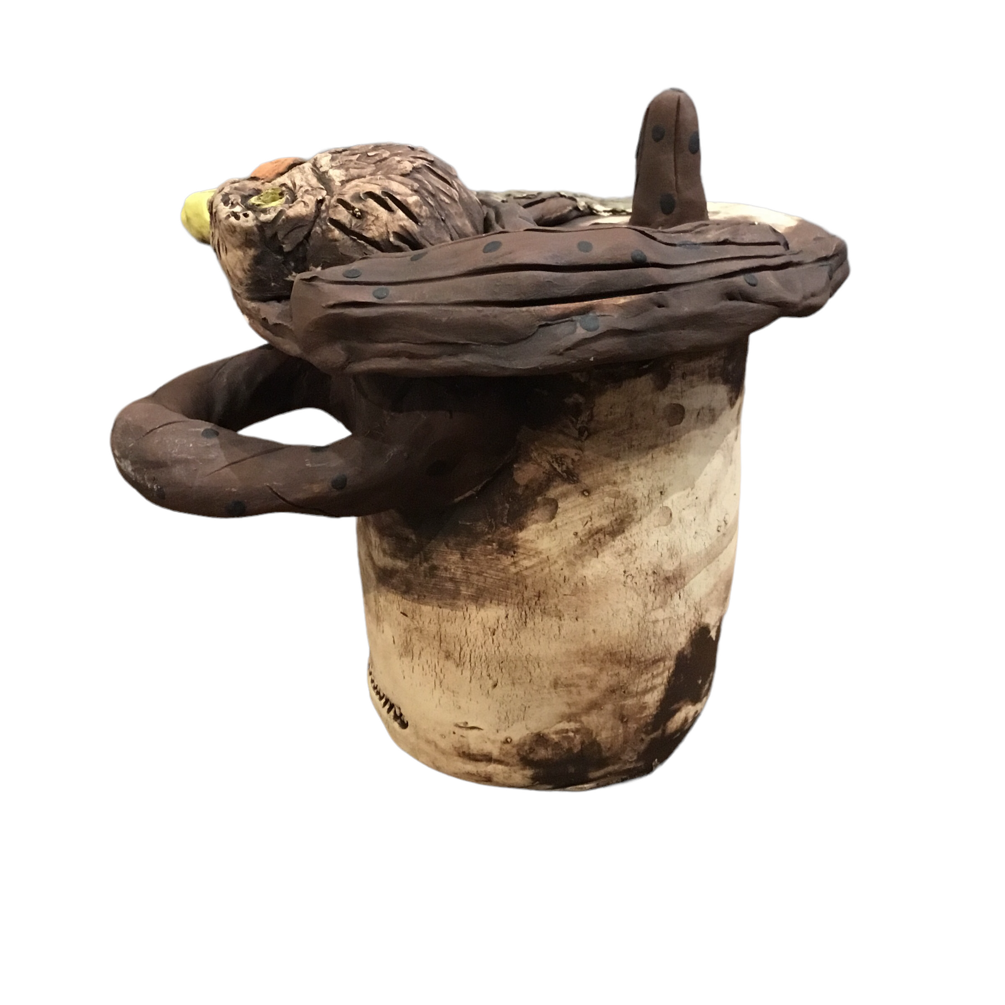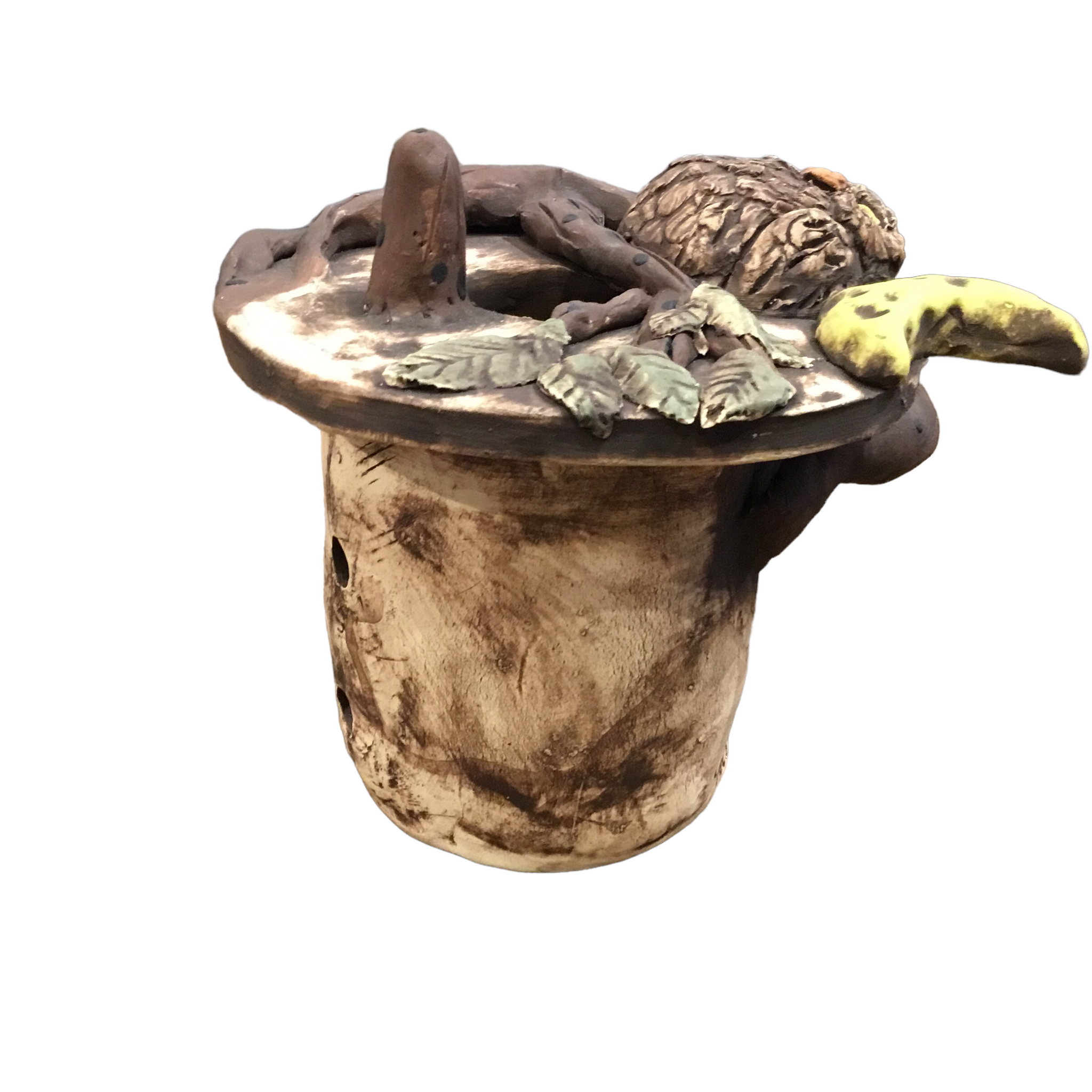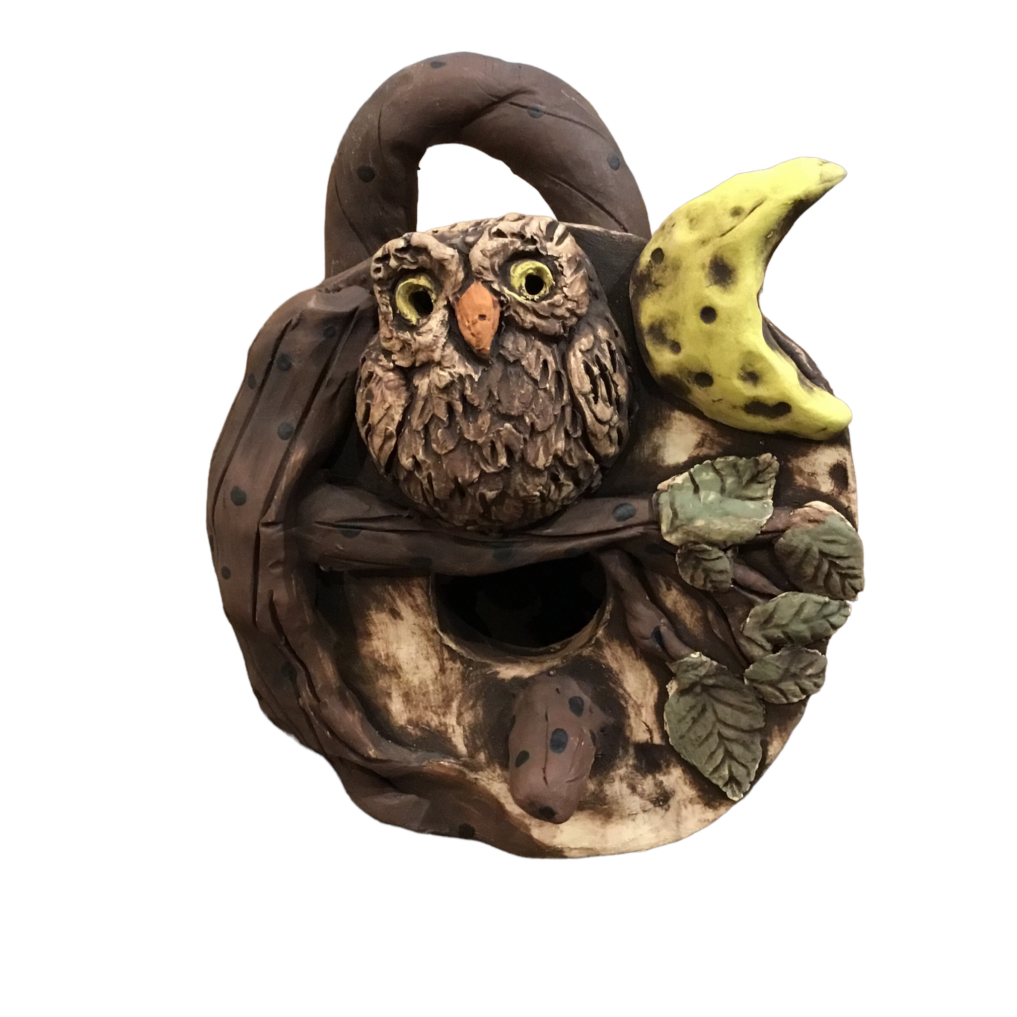 Ceramic bird house, owl and moon decoration on front is approx 7" tall, house is approx 5" deep