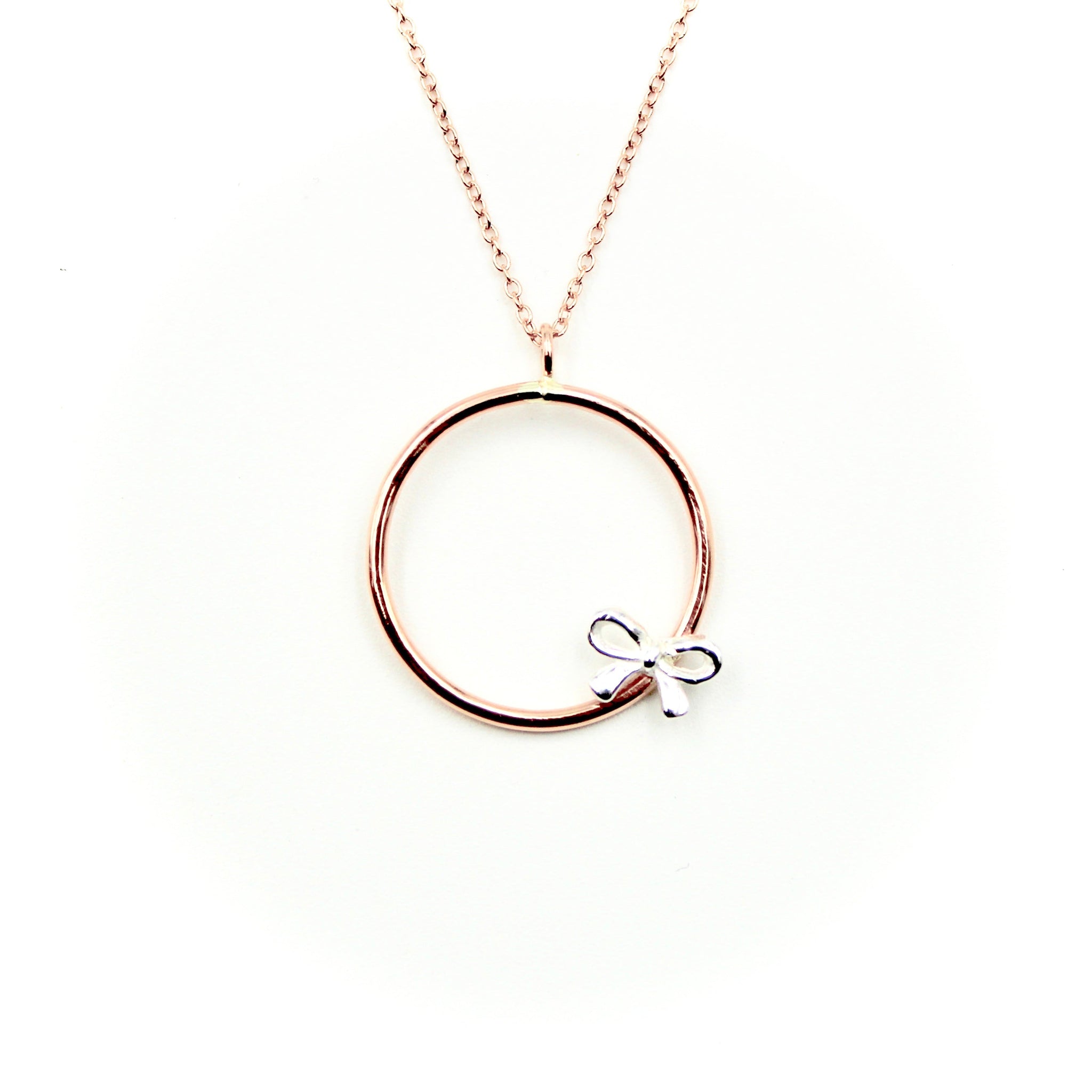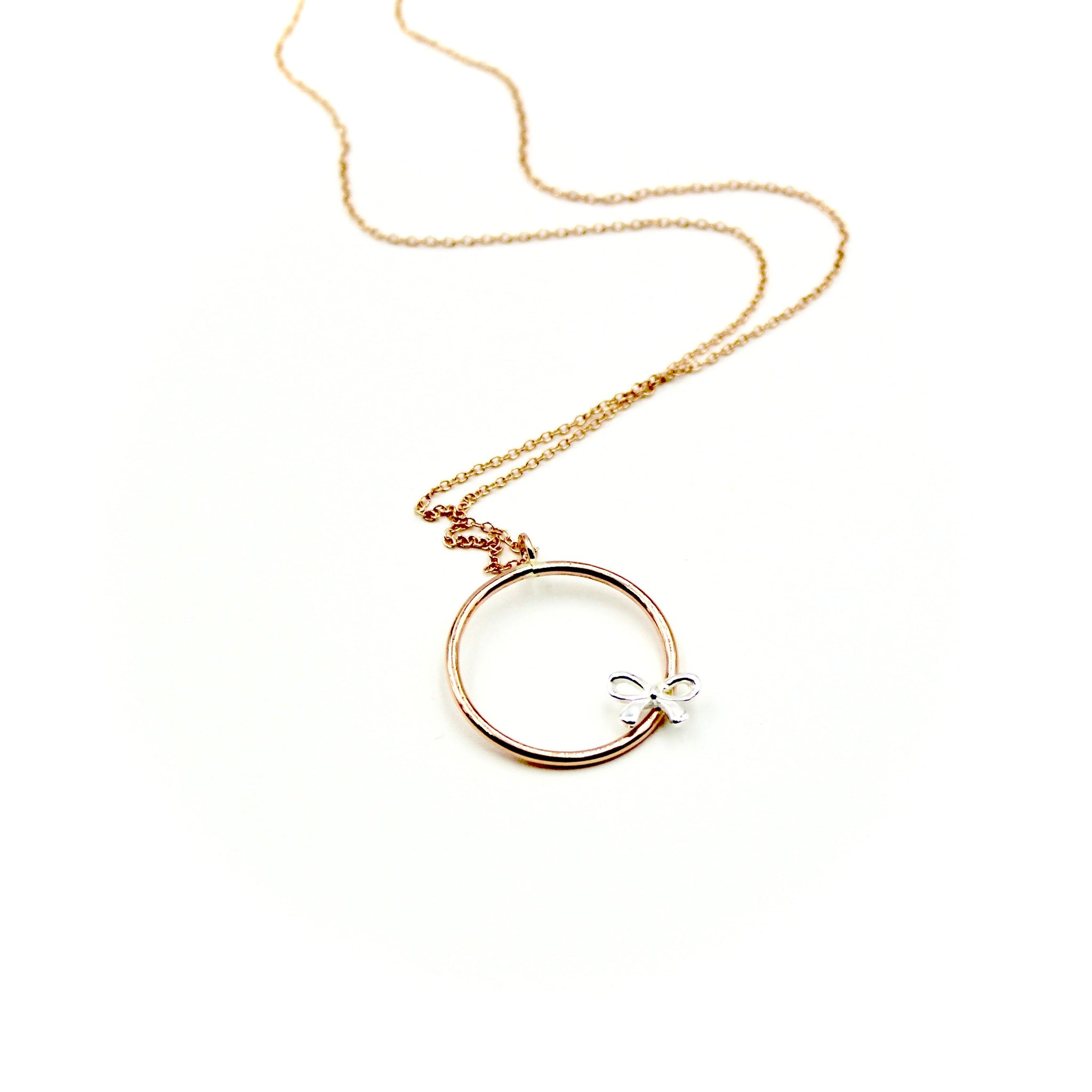 This necklace features rose gold-filled circle charm with a tiny sterling silver bow.