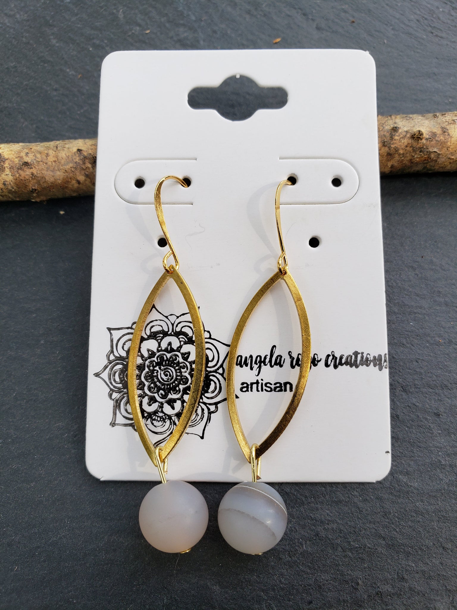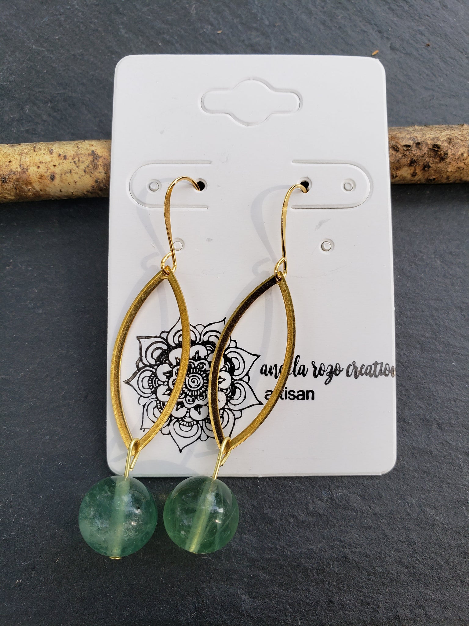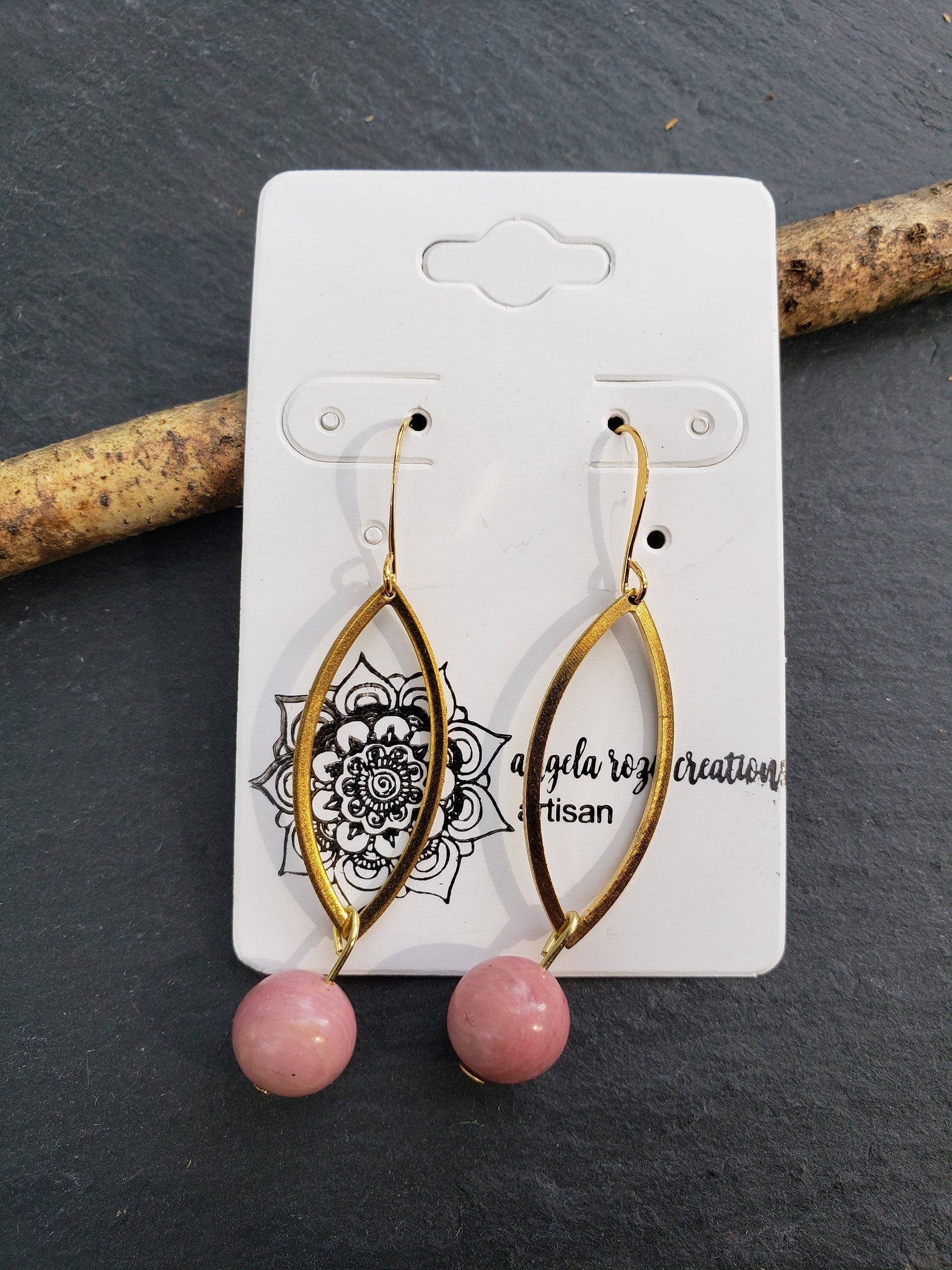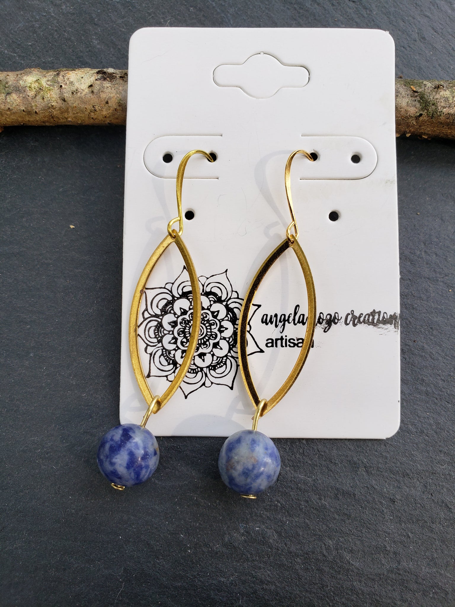 Light earrings in yellow brass with natural gemstone beads. The choices are Amethyst, Brown Jasper, Gray Jasper, Blue Sodalite, White Banded Agate, Pink Rhodochrosite, Green Fluorite, Mint Green Amazonite, Red Jasper, Yellow Citrine.
