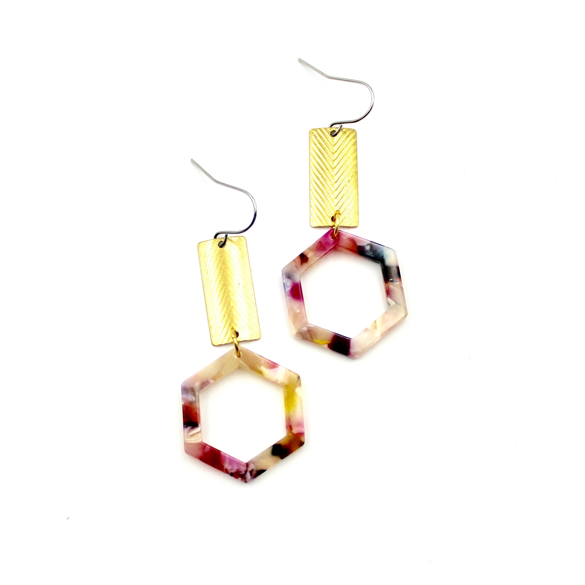 This adorable pair of dangly earrings feature colorful hexagon charms paired with textured rectangle charms. Includes rubber backs.