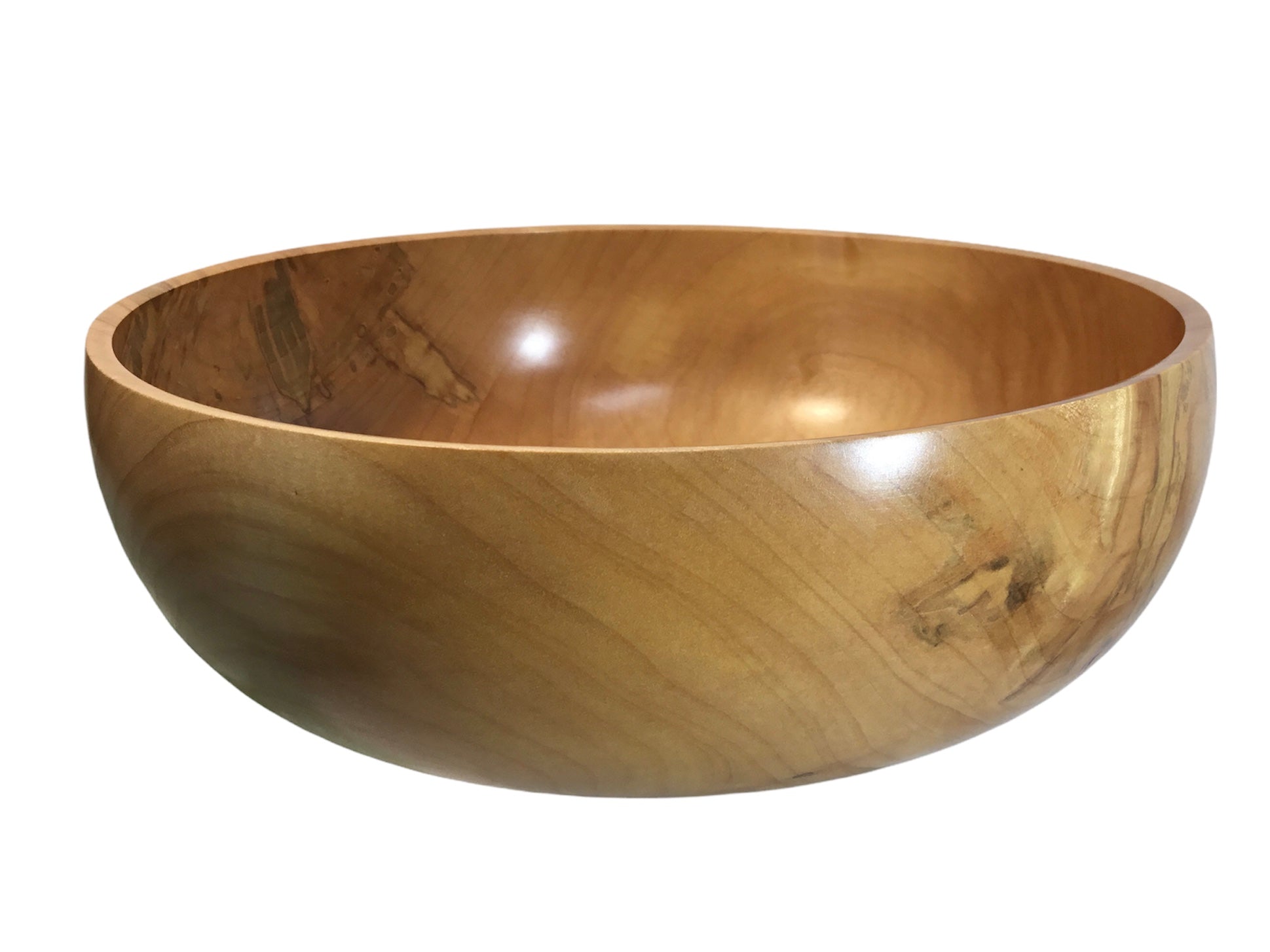 This is an Ambrosia Maple bowl that has lovely leaf patterns on each side of it and grain and color that dances around the bottom. It also has a very pleasing feel to the hands when you let the curved sides rest in your hands. It is finished with wipe on varnish, buffed, and waxed. Use dry items only in this bowl and refresh as needed with a quality furniture polish.