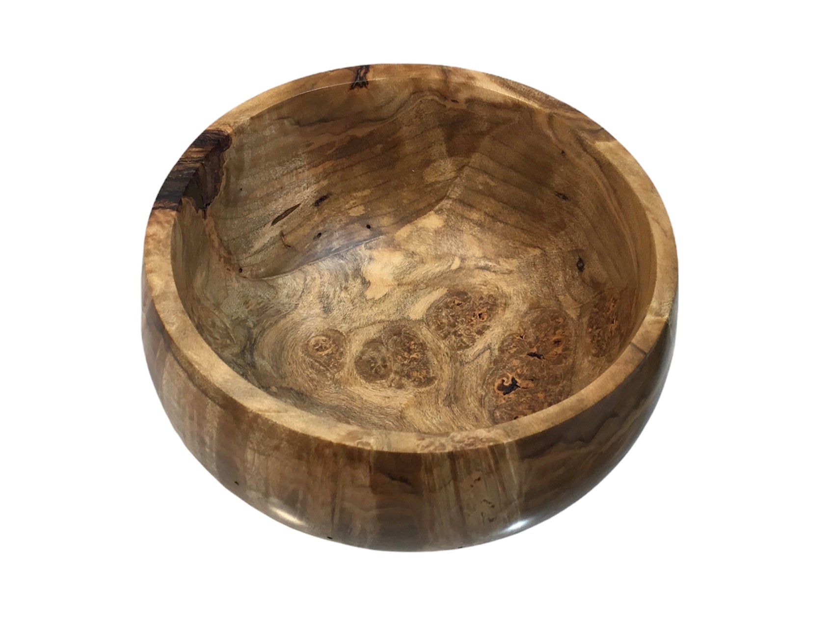 This piece comes from a Maple burl. It has wonderful birds' eyes and radians that mixes with the irregular grain pattern. This is an eye catcher. For dry items only. Finished with wipe on varnish that is buffed and waxed. Refresh with a quality furniture polish.
