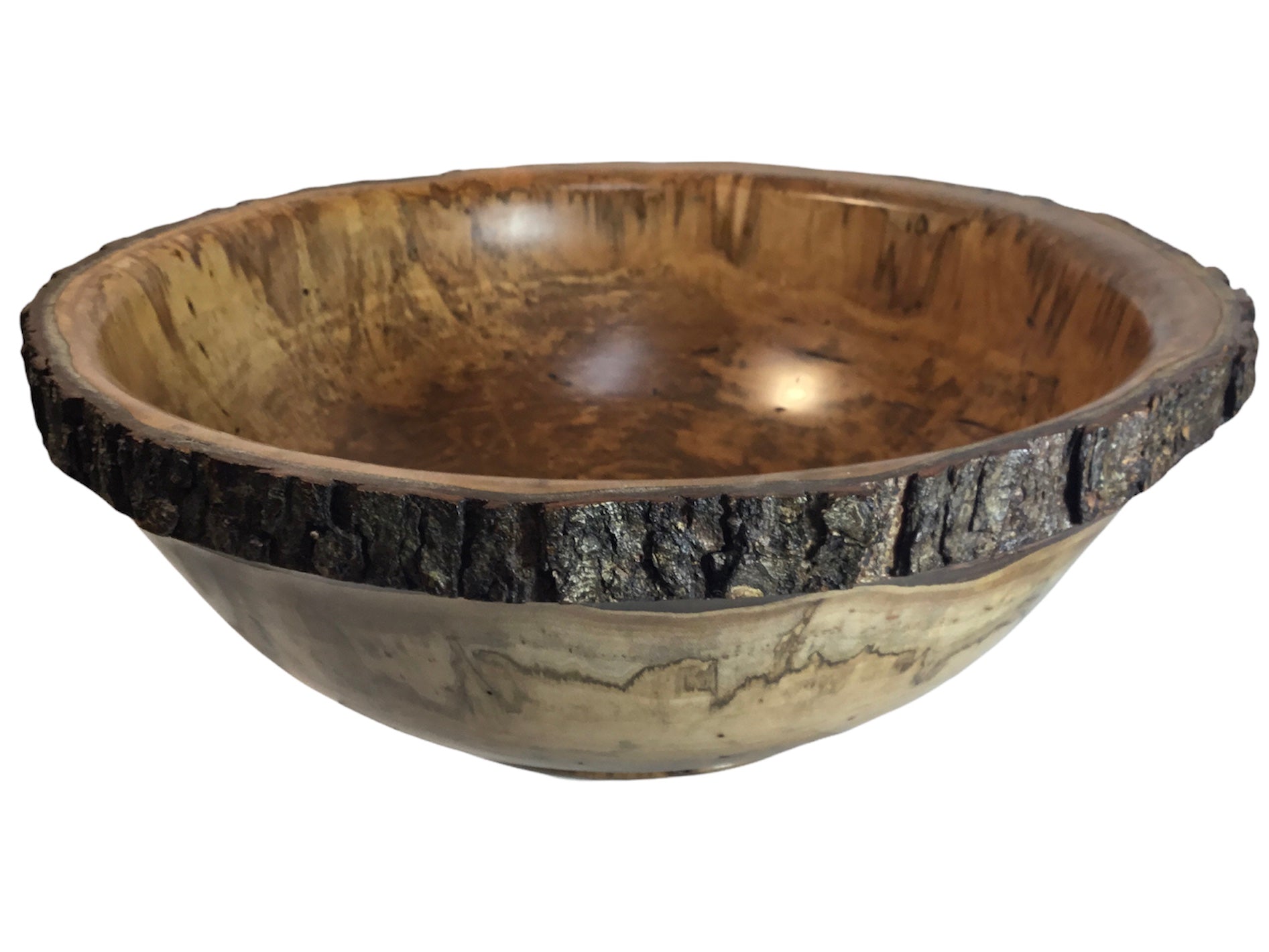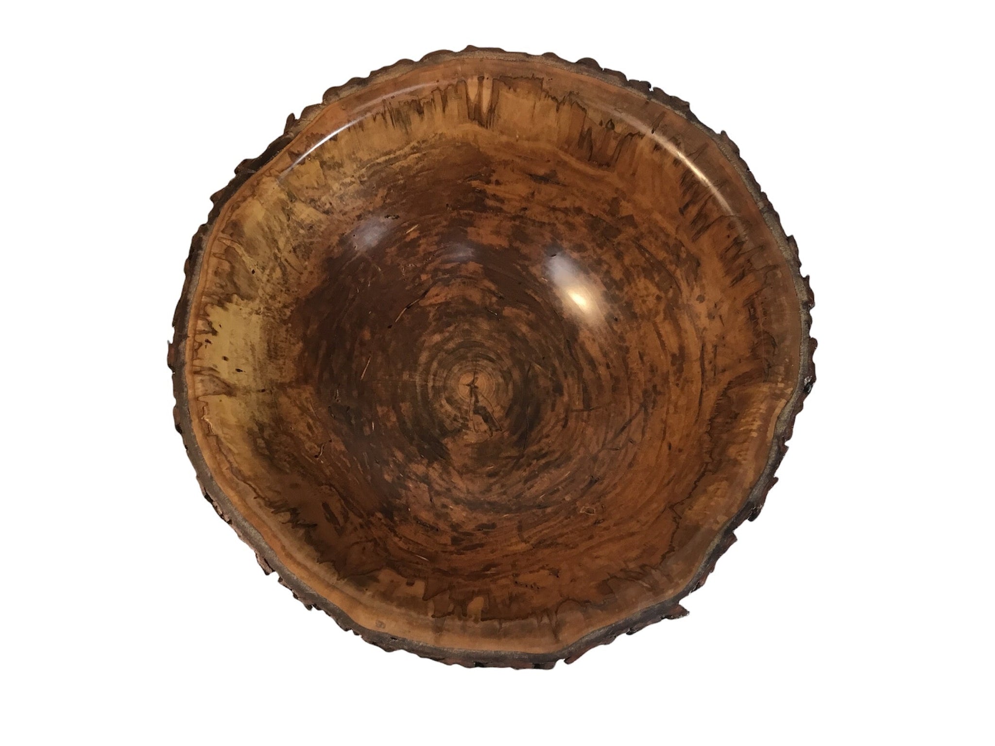 This is a large Maple bowl that was turned end grain and left with a natural edge. Beetles had infested this tree and left their calling card of holes and distinct brown color pattern. It is finished with wipe on varnish, buffed, and waxed. Use only dry items in the interior. Refresh as needed with a quality furniture polish.