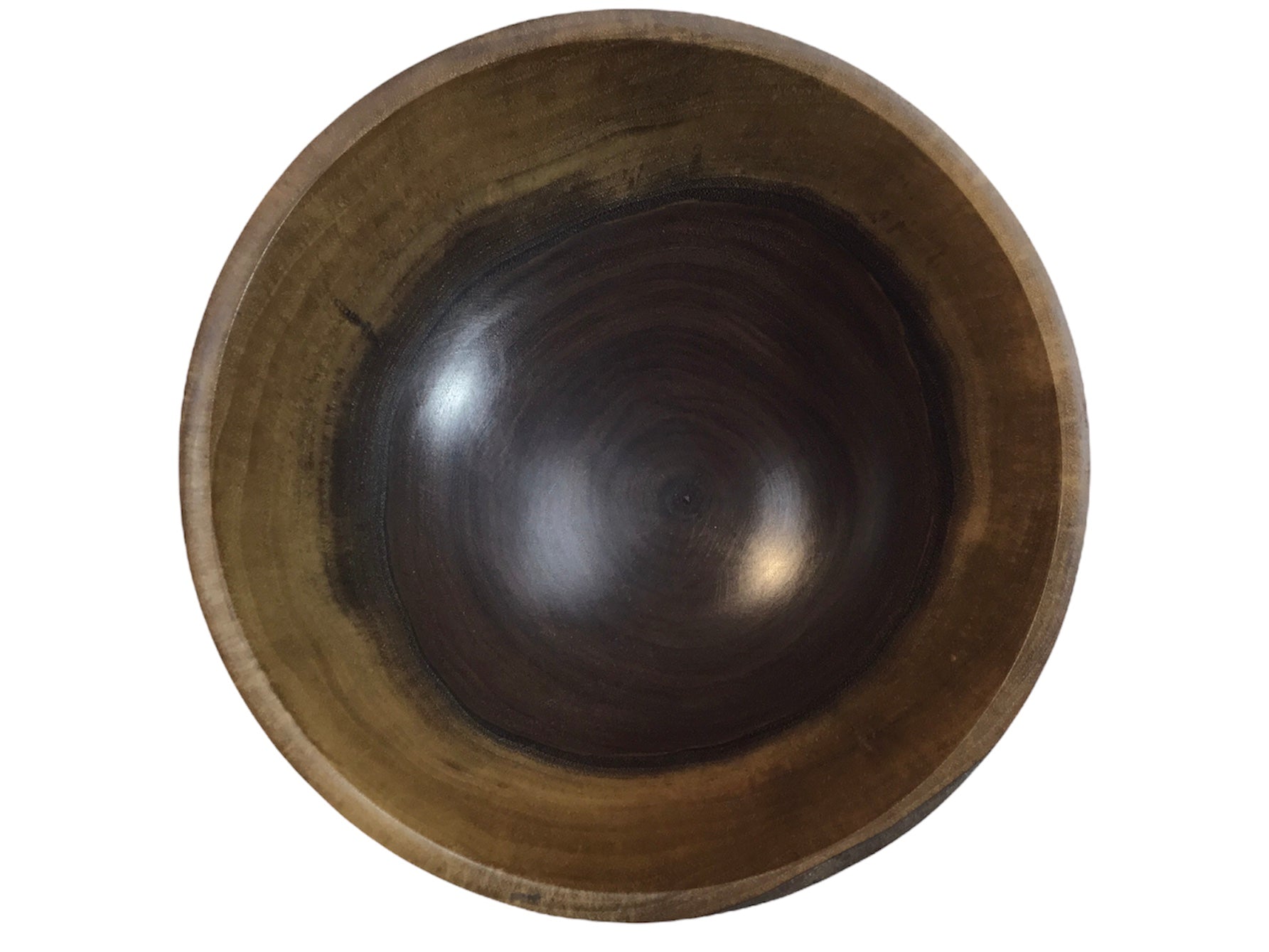 The piece is turned edge grain which separates the new wood from the old leaving two distinct circles. You are drawn towards the center and dark place as you follow the circular grain pattern that draw you to look for the hidden "treasure". It is finished with wipe on varnish, buffed, and waxed. Only dry items can be placed in this bowl. It can be refreshed with quality furniture polish as needed.