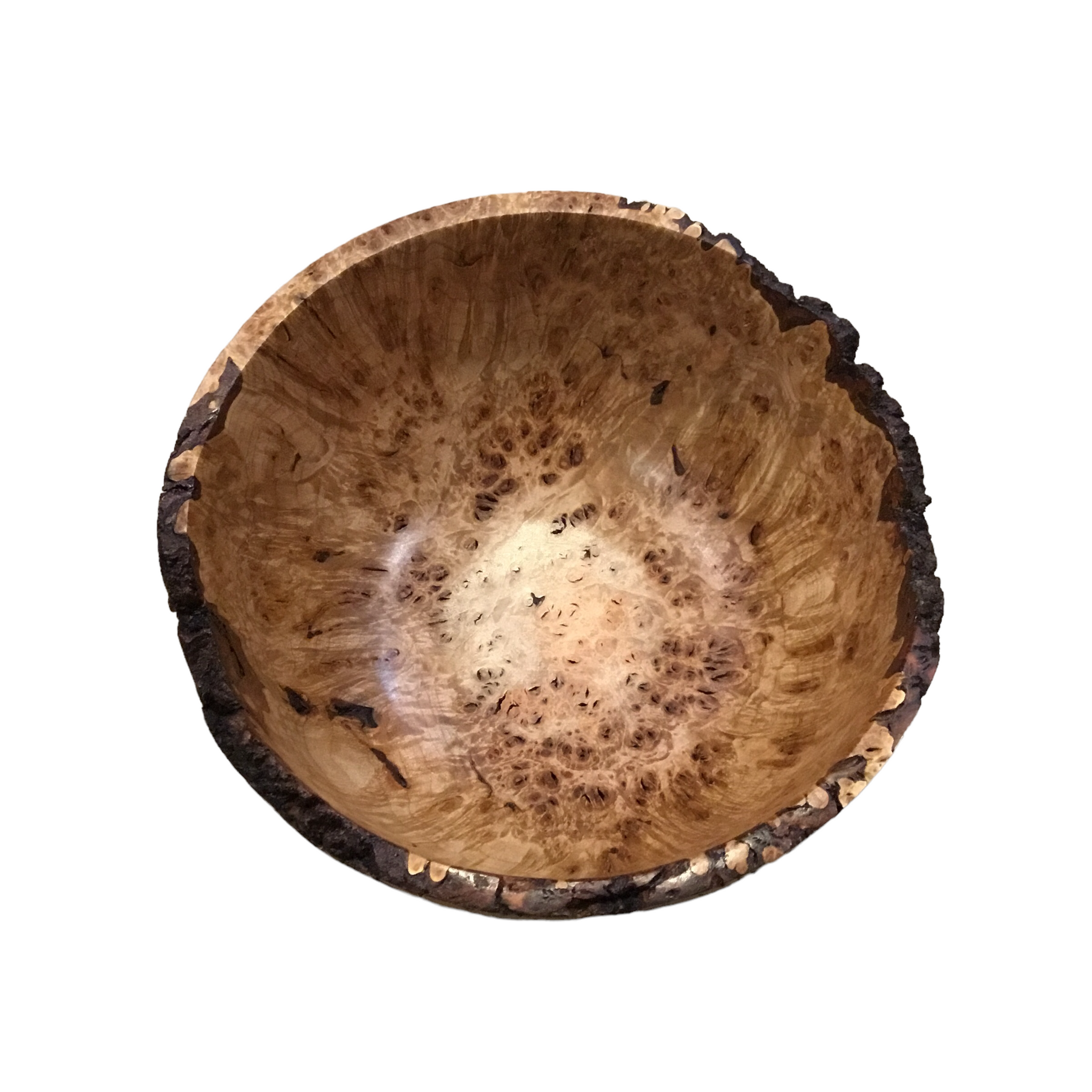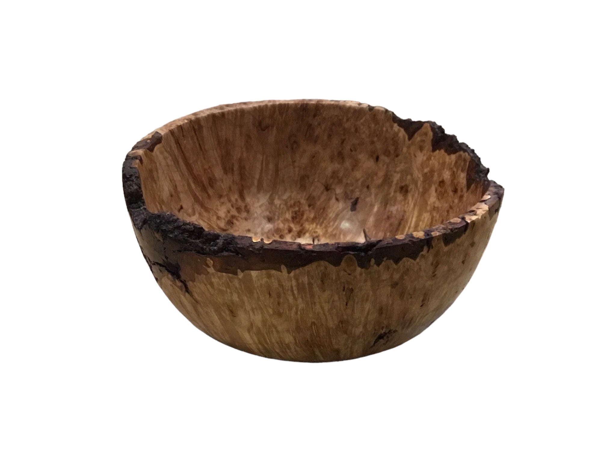 Natural edge maple bowl with birds' eyes caressing the bottom and radians climbing up the side. This pattern is manifesting on the outside as well. The top finishes off the piece with bark from the tree. This piece is finished with wipe on varnish which is then buffed and waxed. You can place dried items inside the bowl but nothing damp. You can wipe it from time to time with a quality furniture polish.