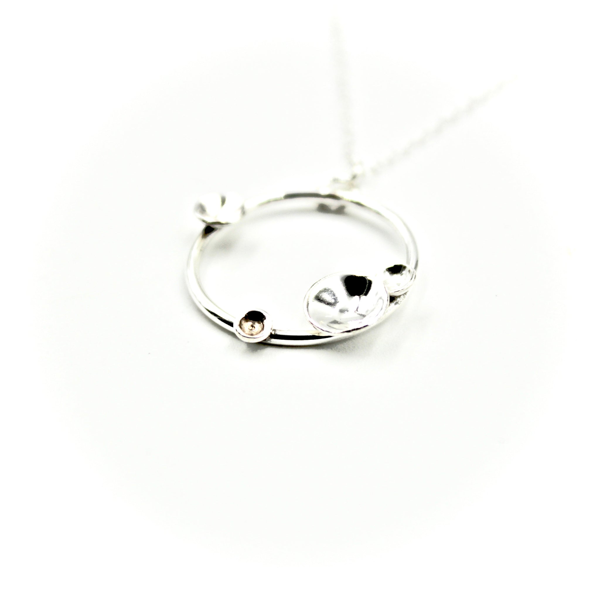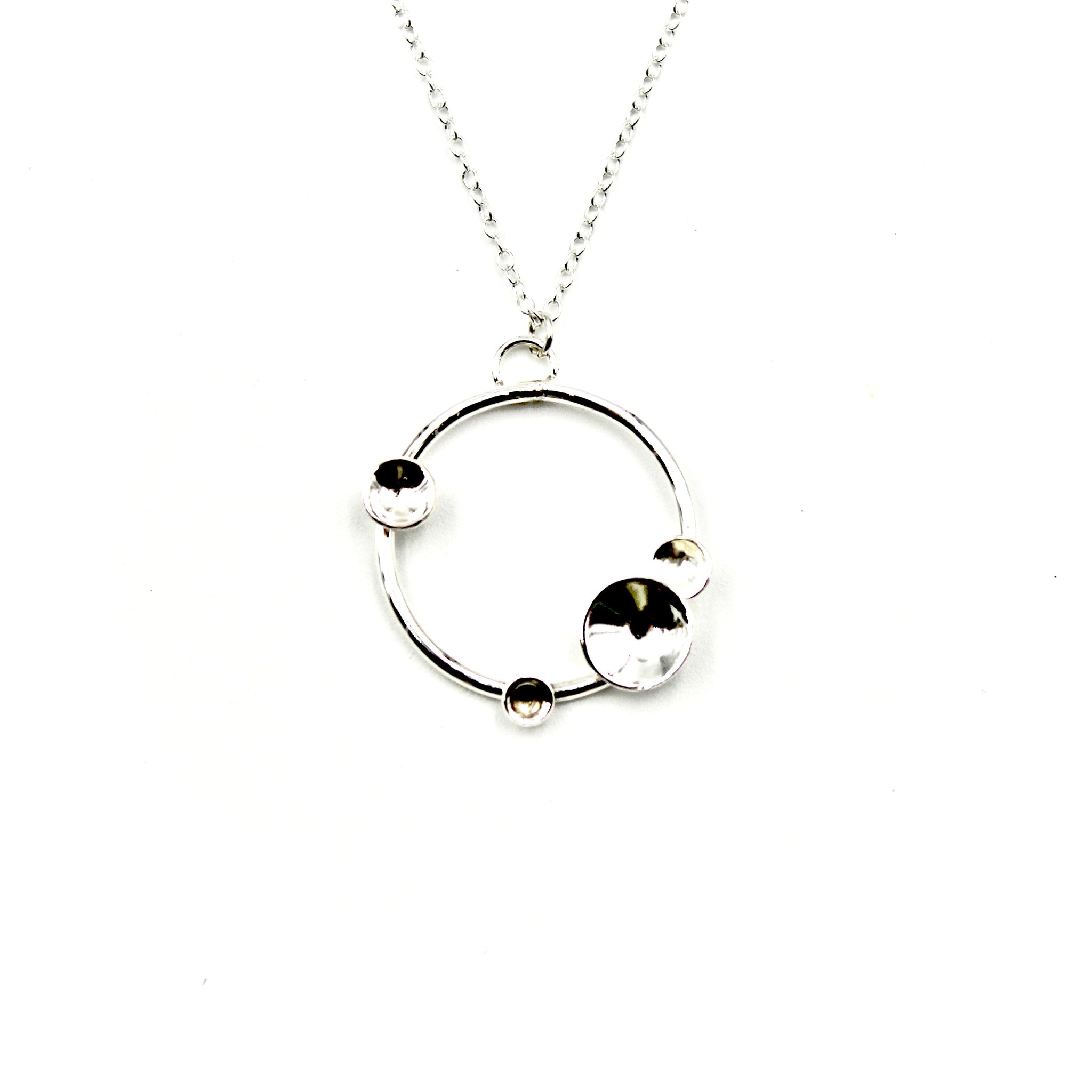 This necklace features a round charm with several domed circles nesting along the edge.