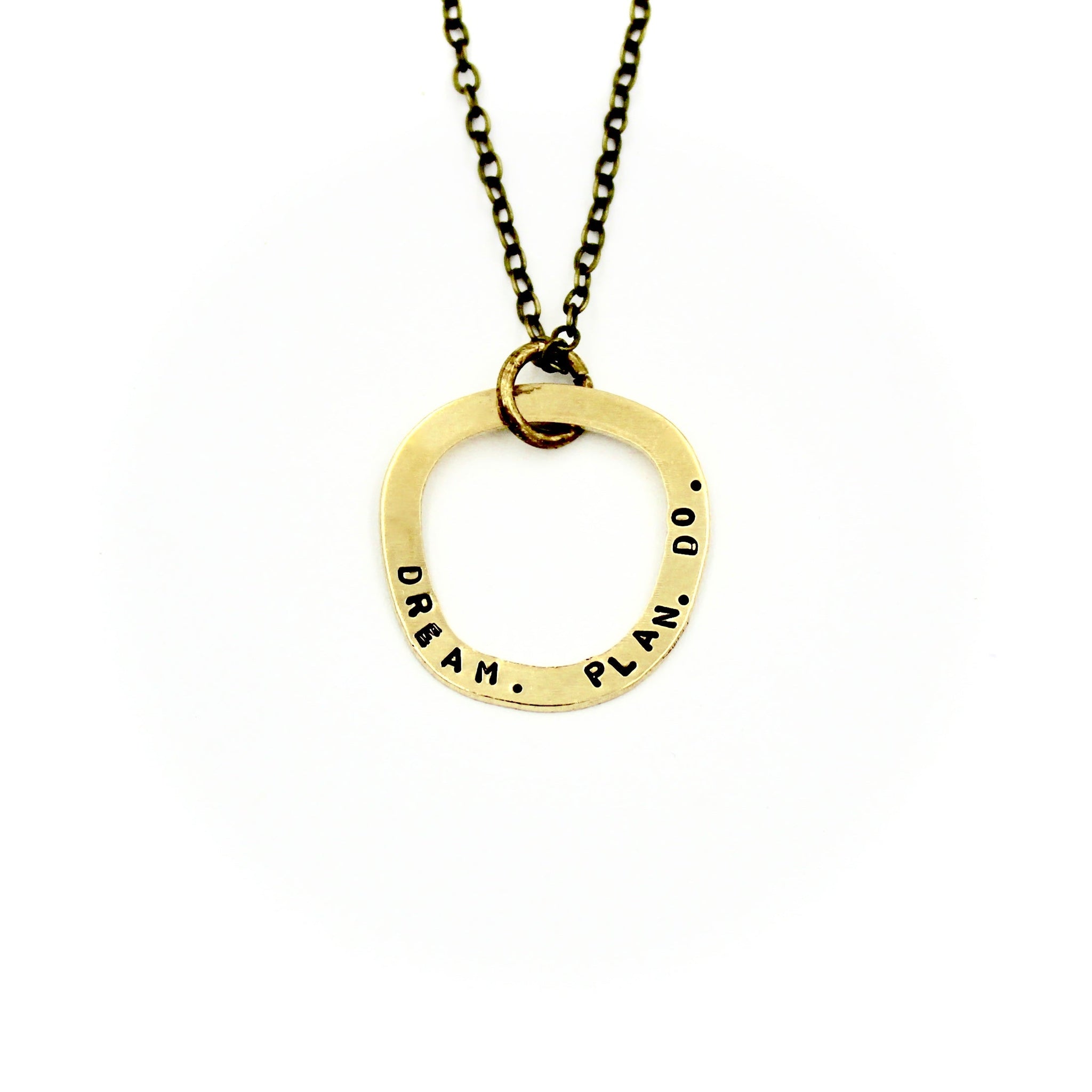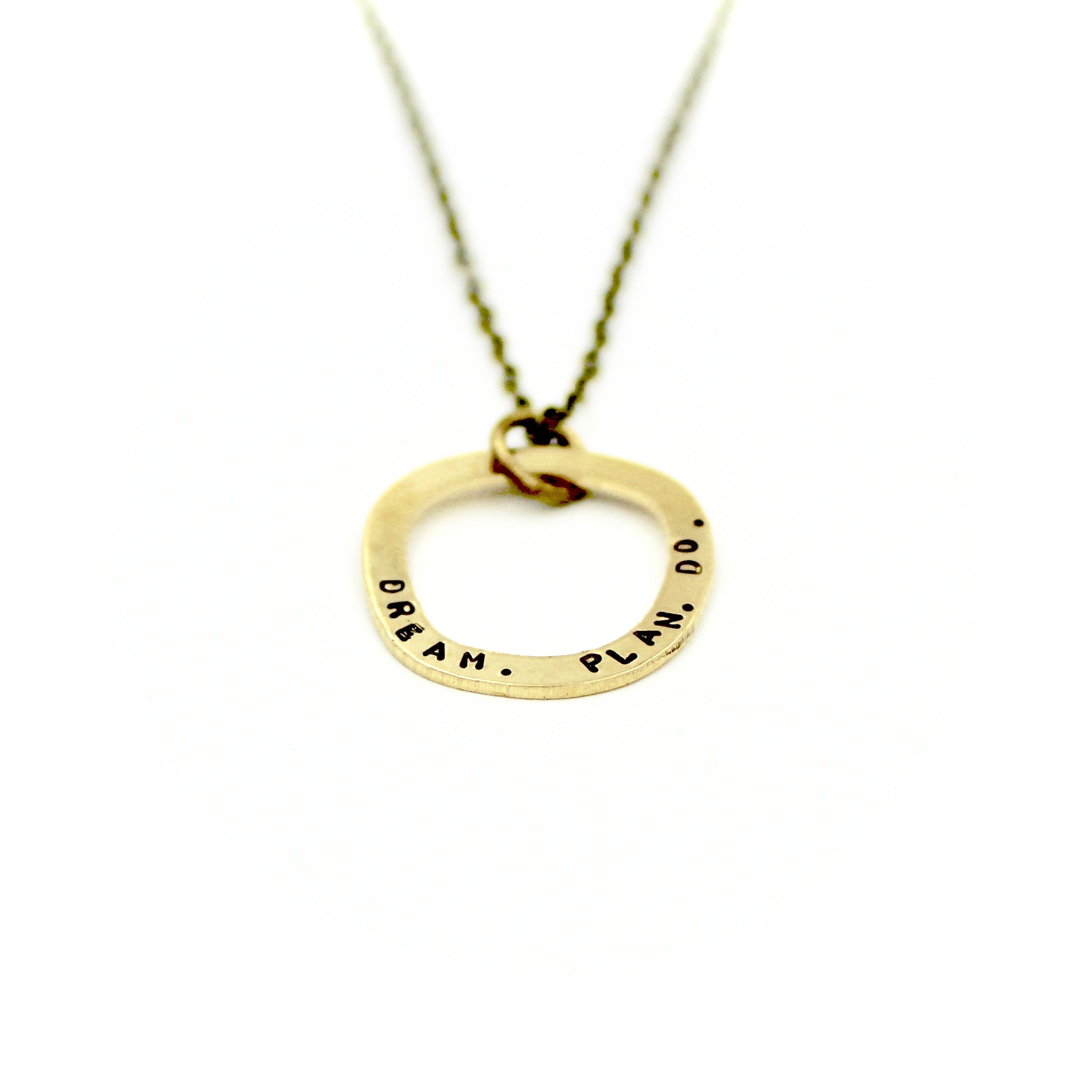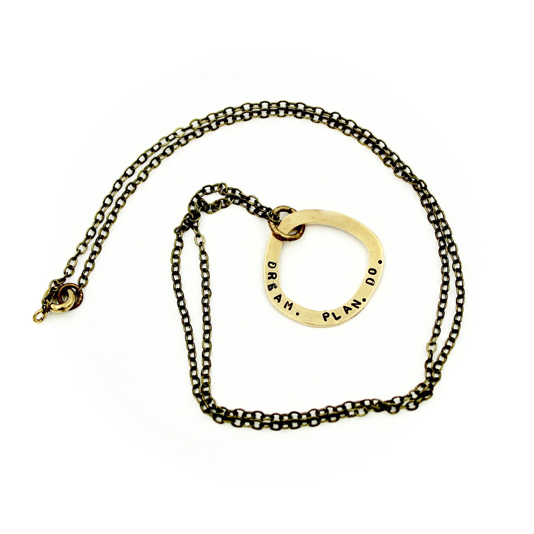 This necklace features a simple charm that's hand-stamped with Dream. Plan. Do.
