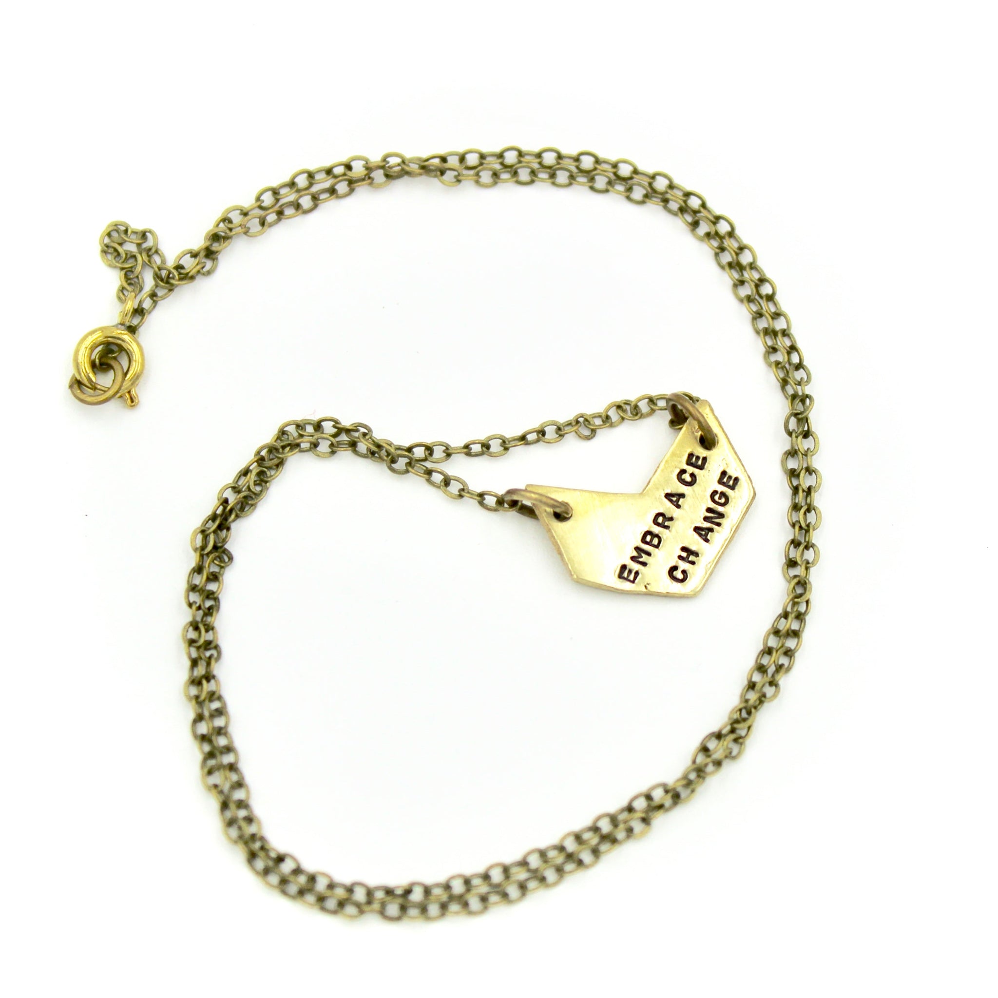 This necklace features an arrow charm that is hand-stamped with embrace change.