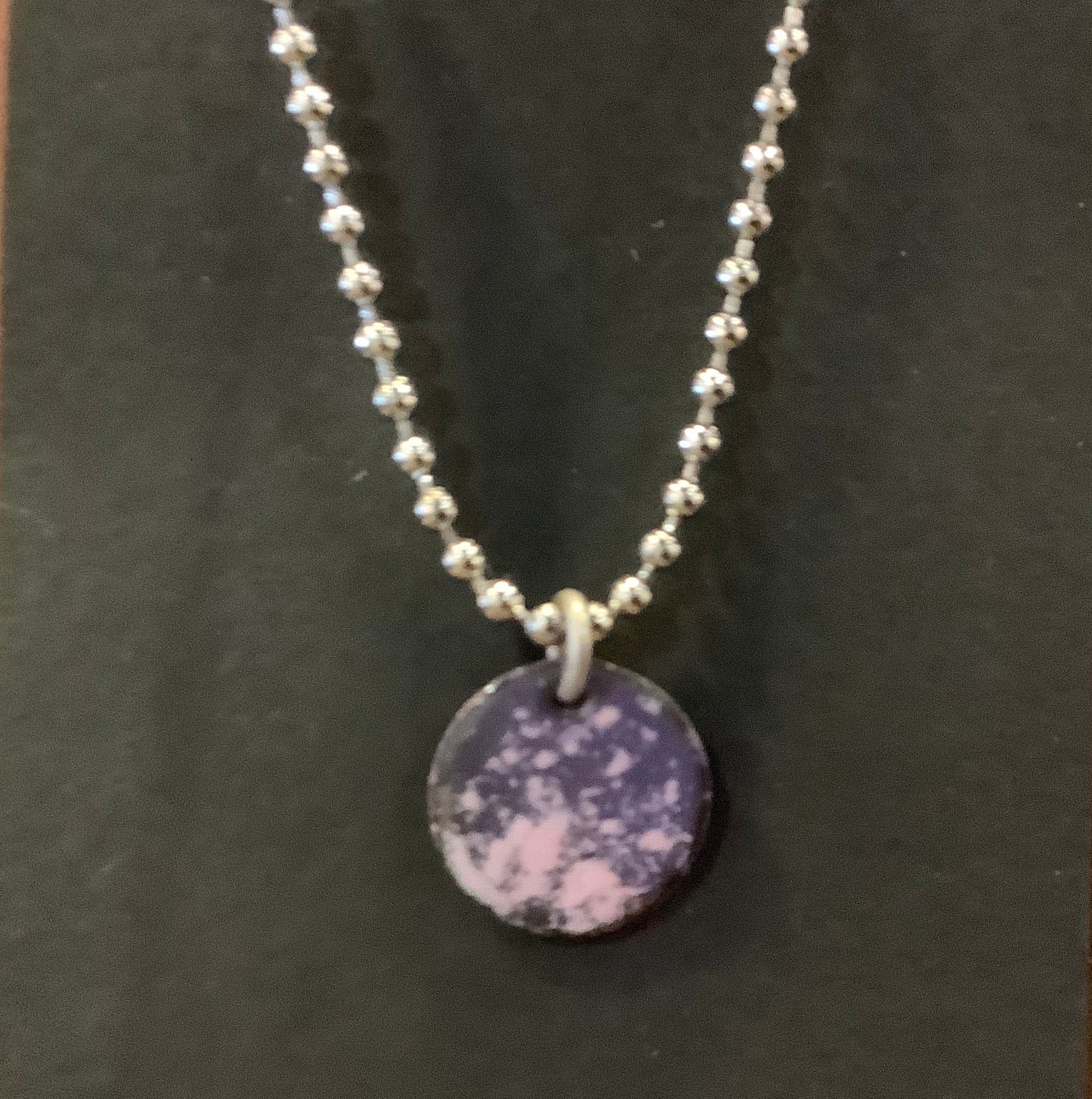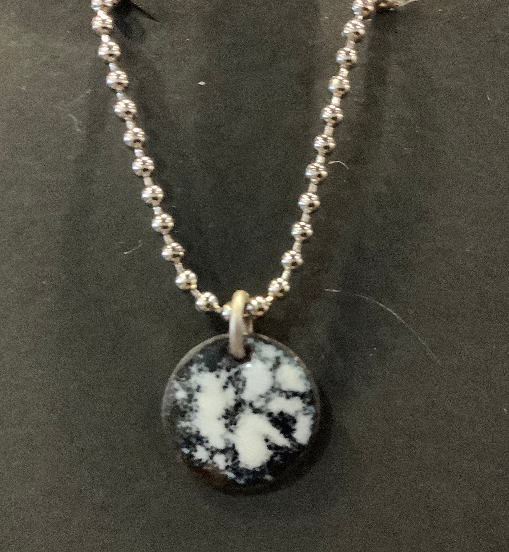 A 1/2" enamel circle charm on ball chain. One of a kind pendants.