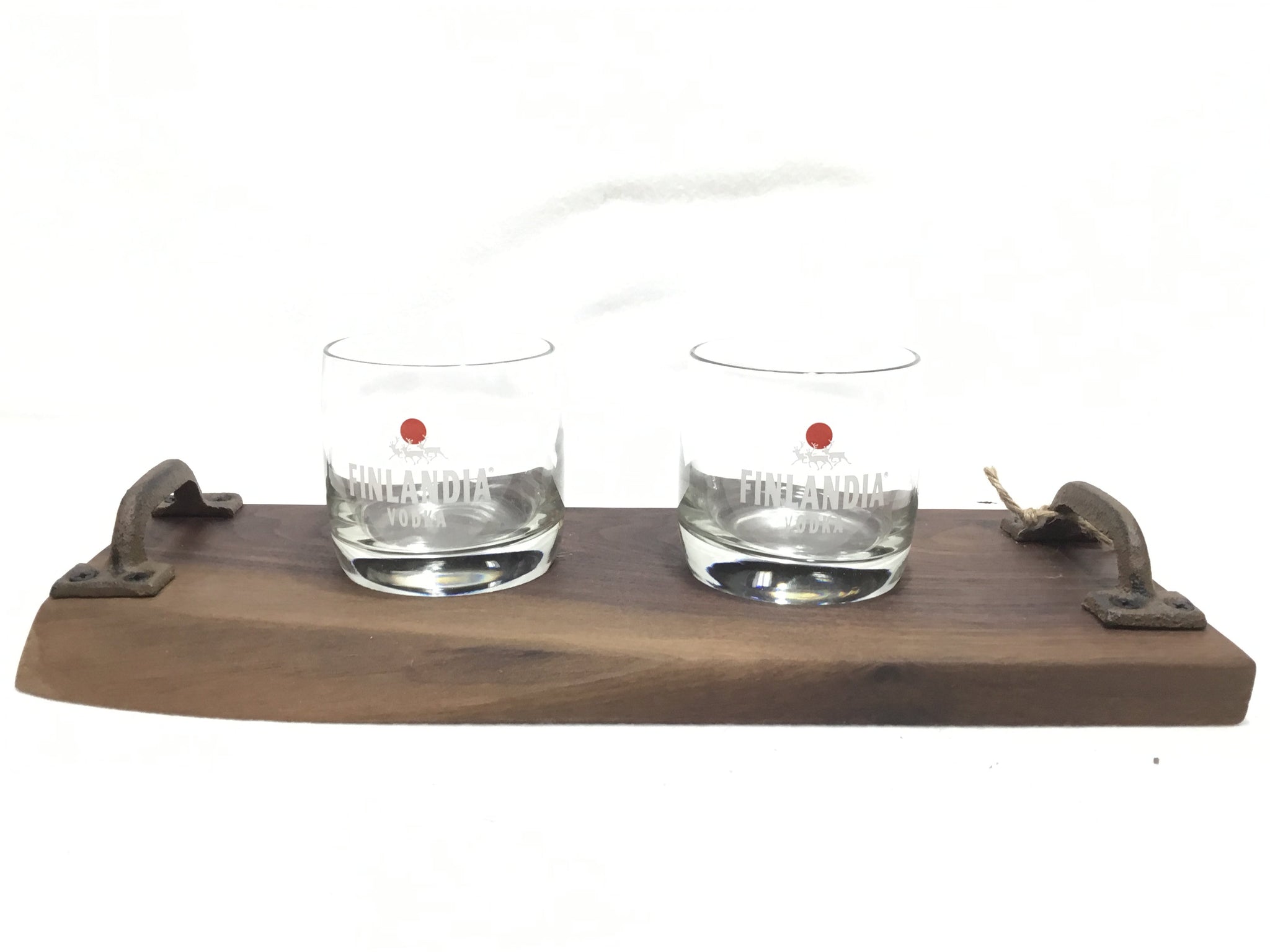Flight board is 13" long x 5.5" wide with metal handles and spaces for two glasses. Finlandia Vodka glasses included.