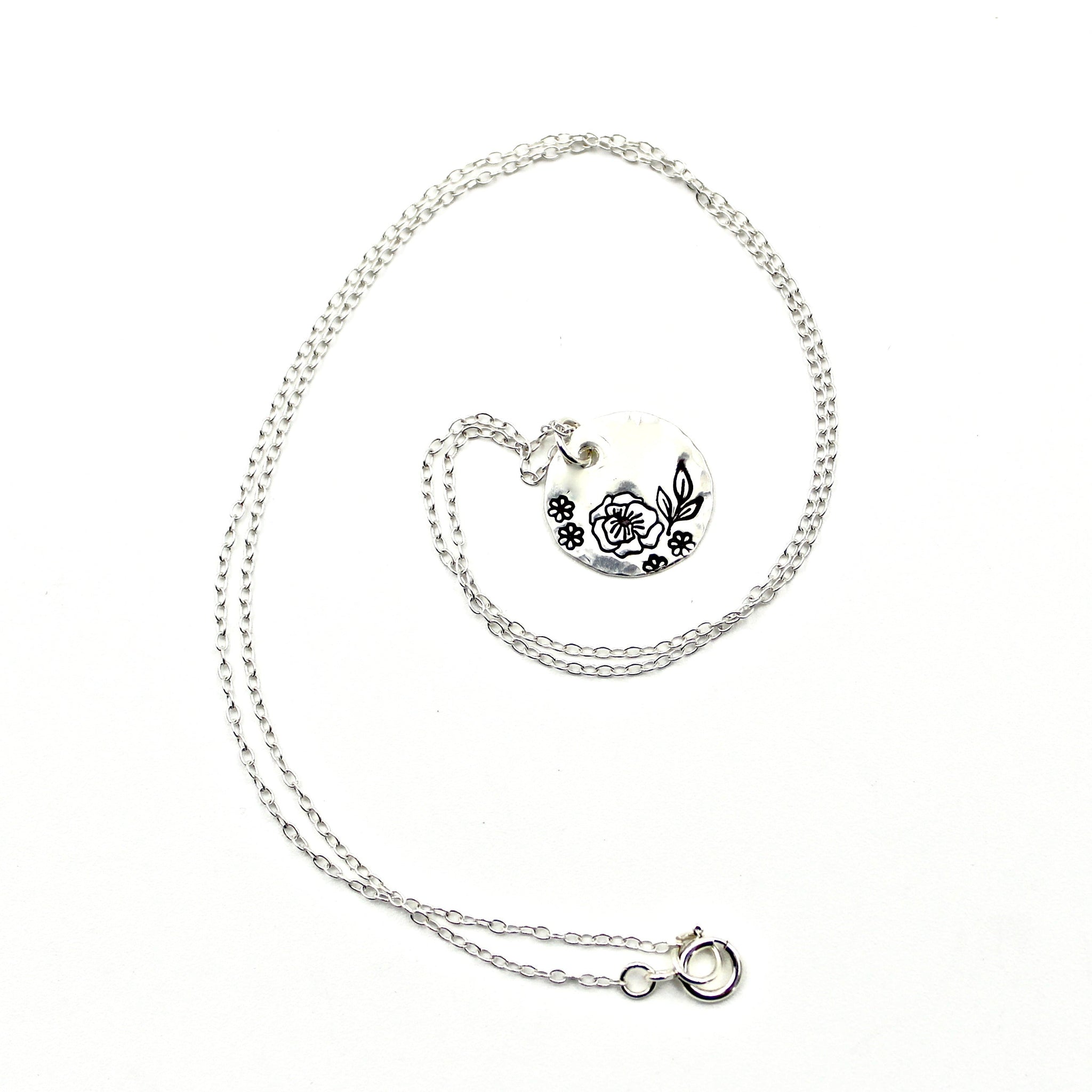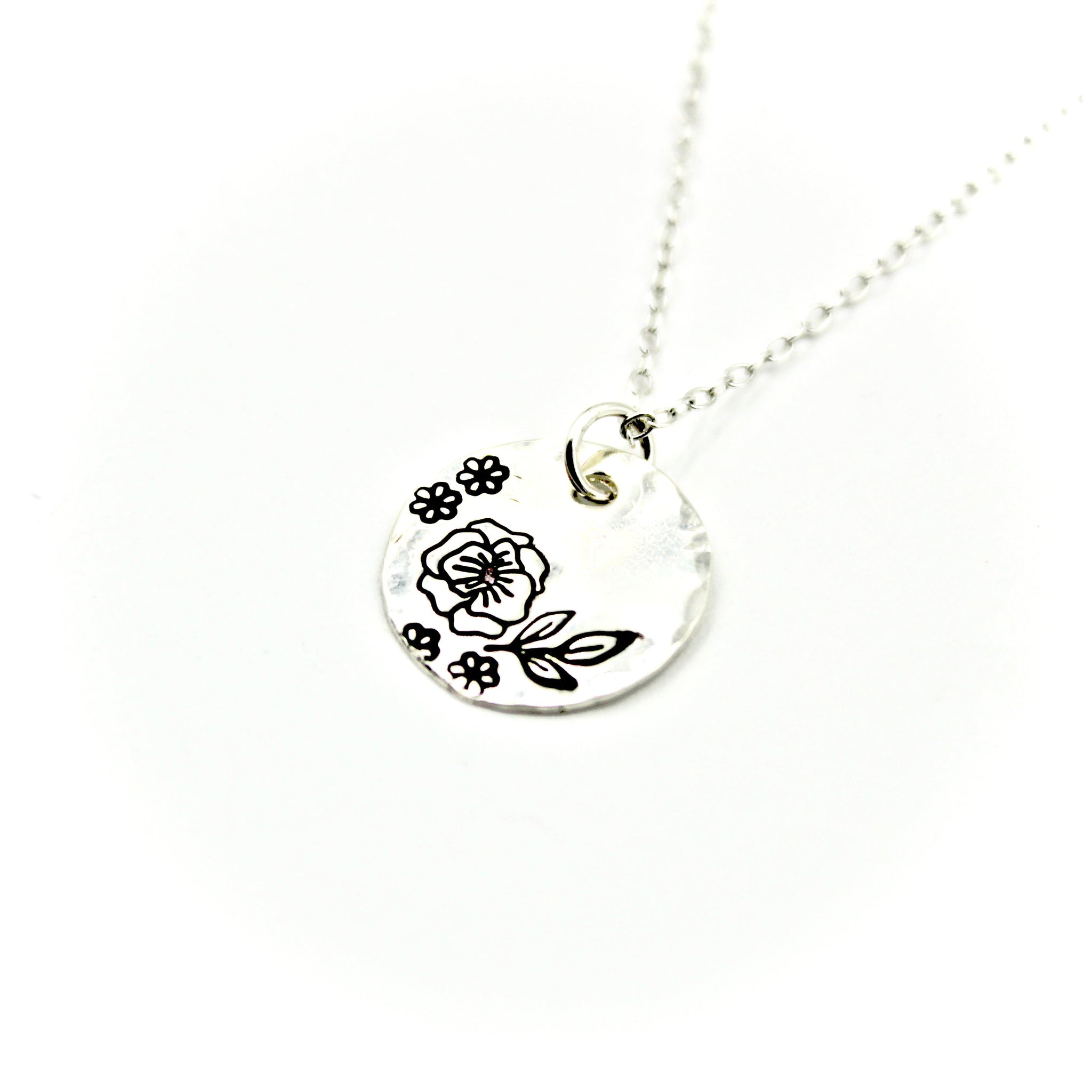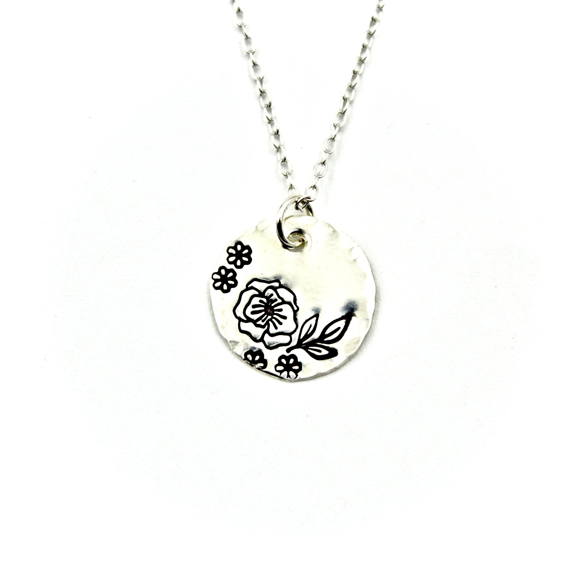 This necklace features a round charm that is hand-stamped with a variety of flowers.