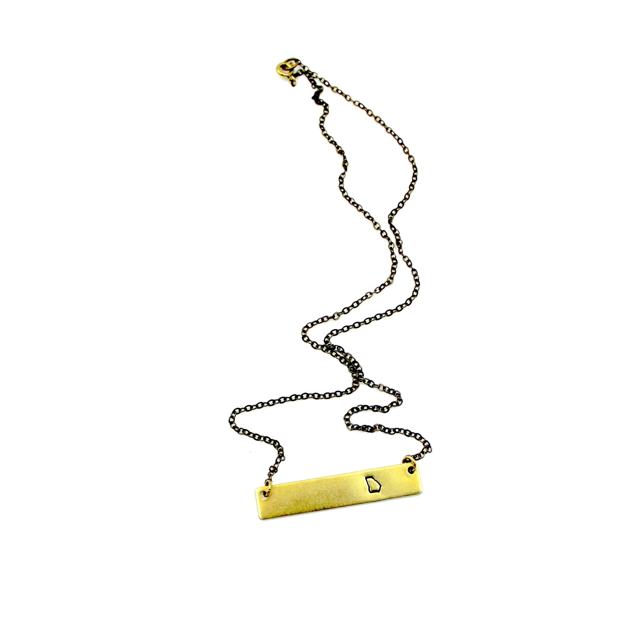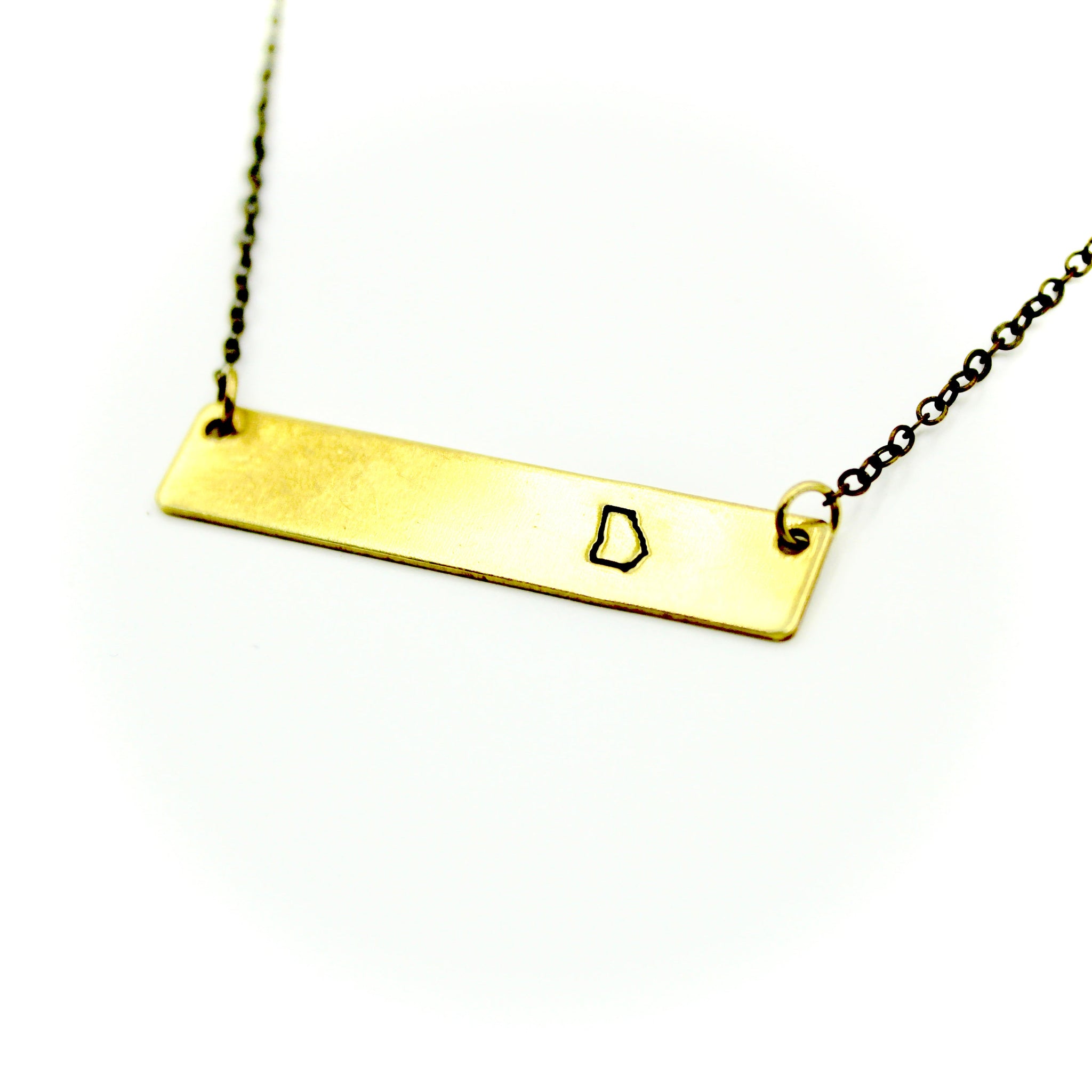 This necklace features a bar charm with that is hand-stamped with a tiny (like 5mm tiny) outline of Georgia.