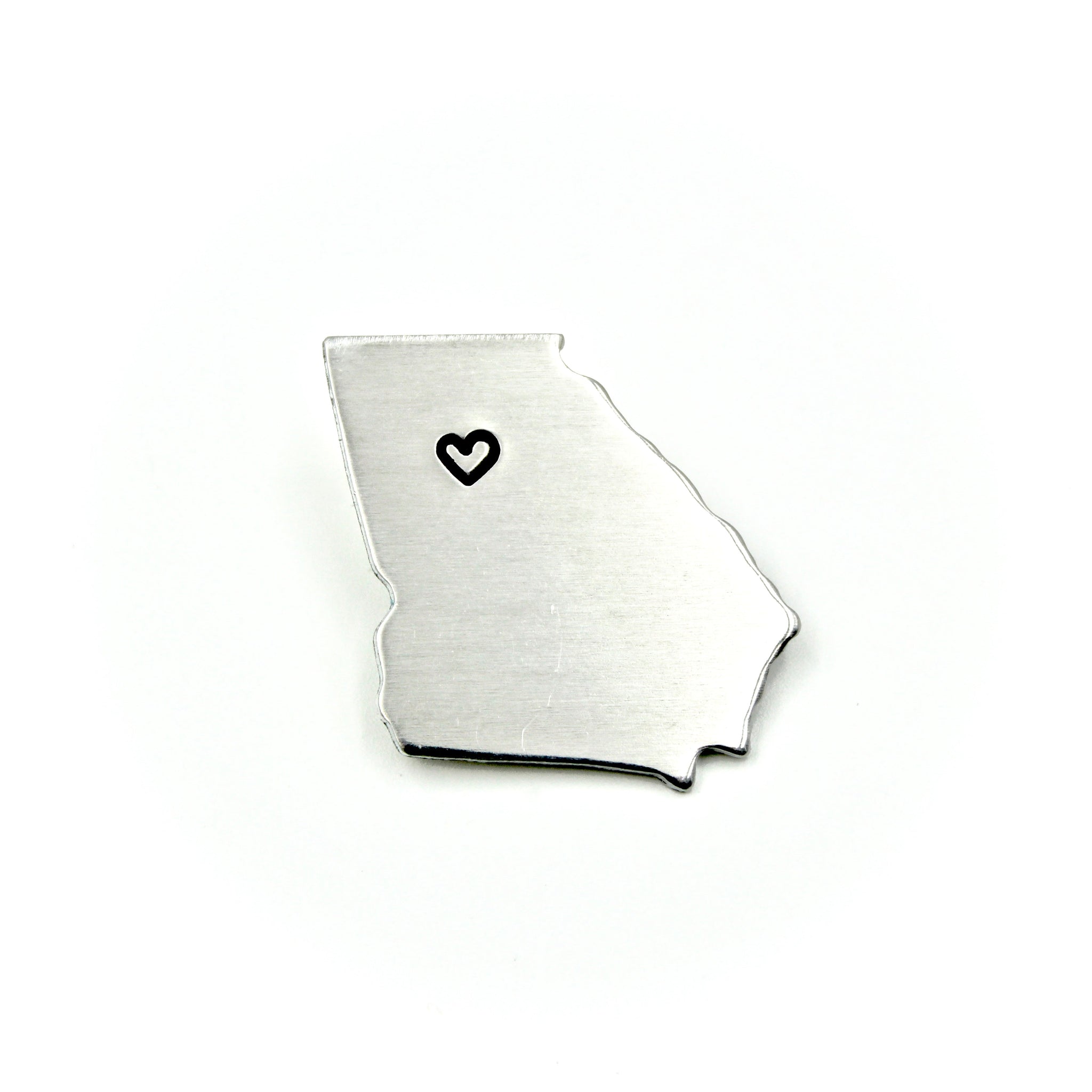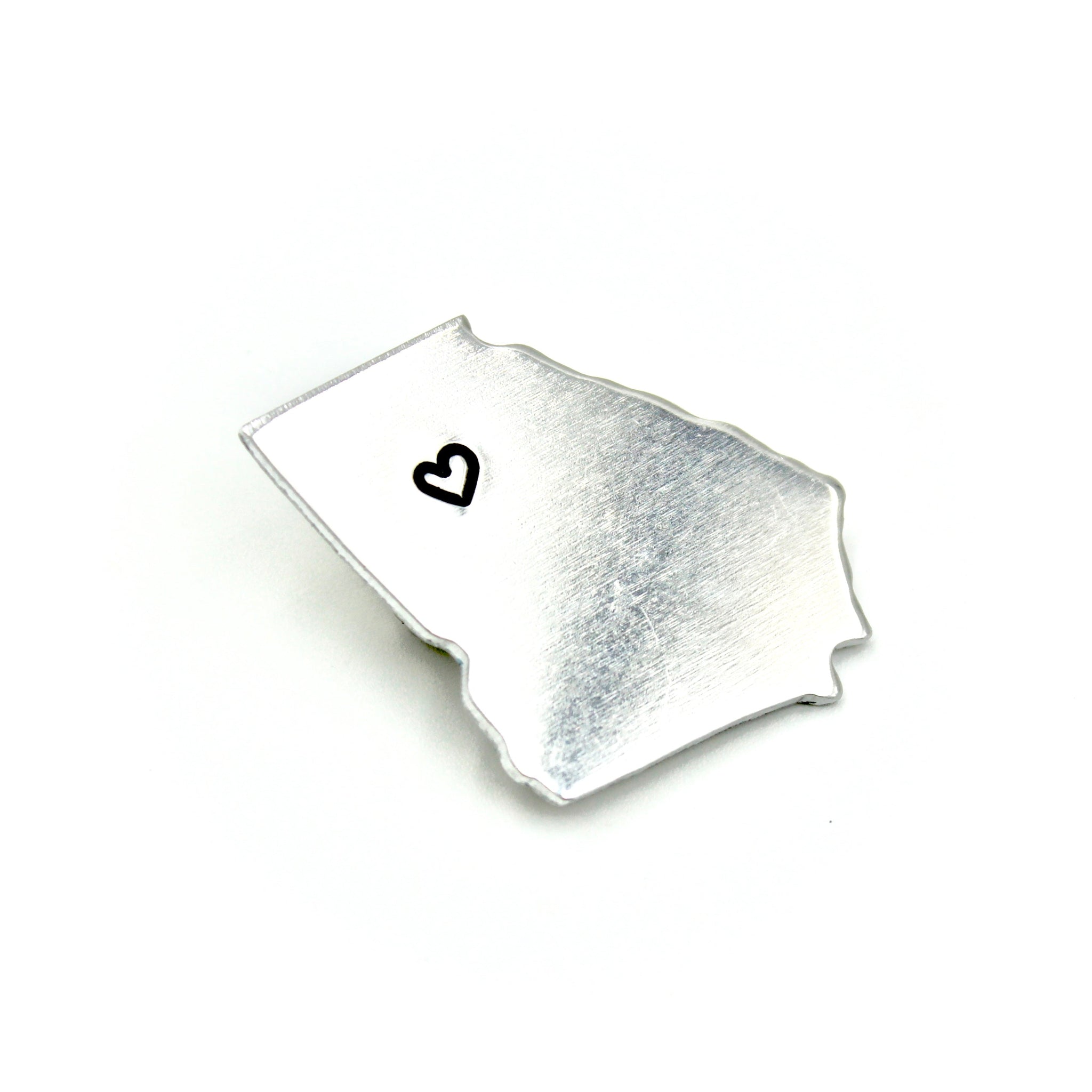 This lapel pin features a thick georgia-shaped charm, what is hand-stamped with a little heart over Atlanta.
