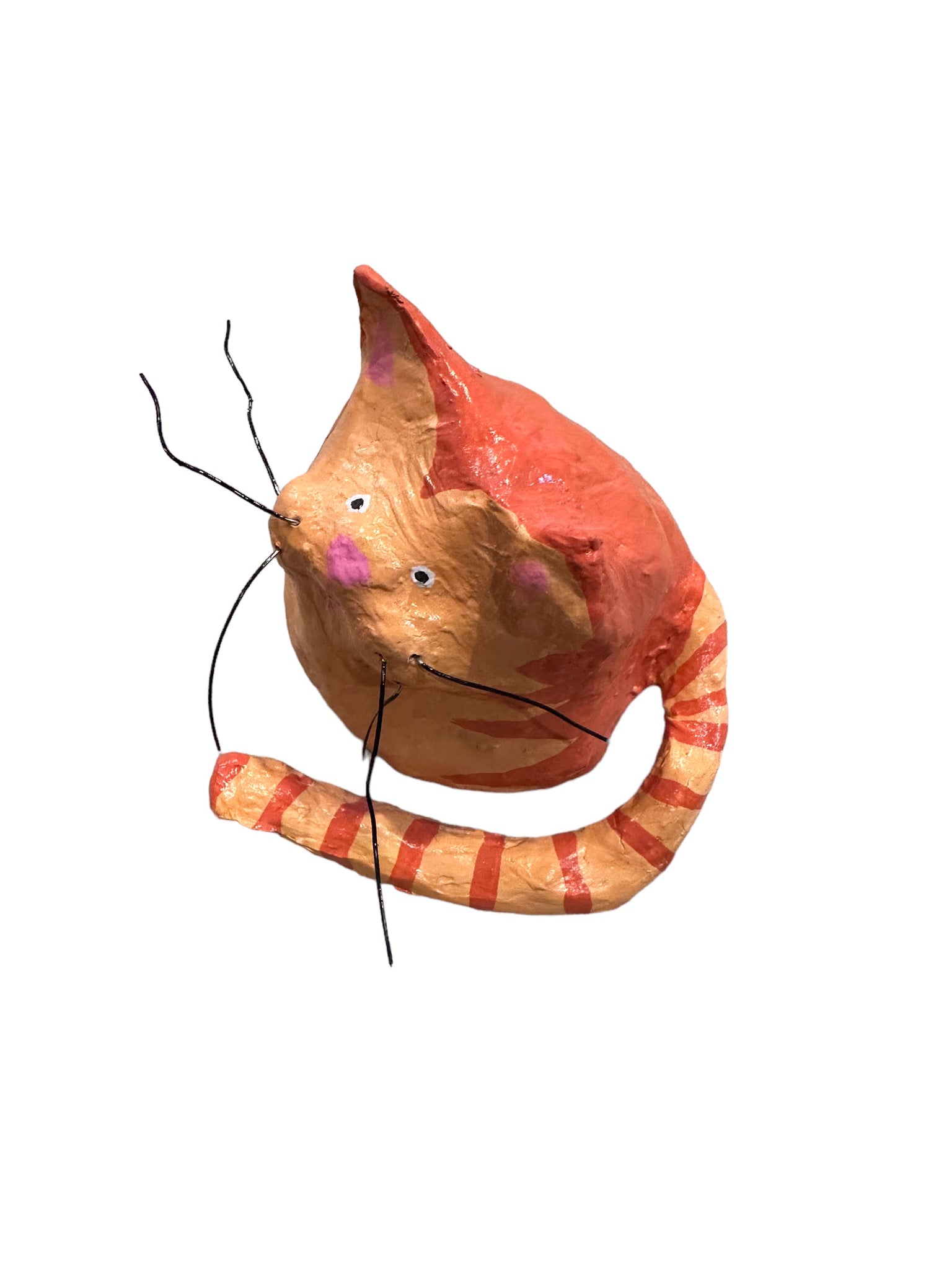 Whimsical orange cat. Approximately 5" tall x 6" wide. Handmade paper mache with recycled materials.