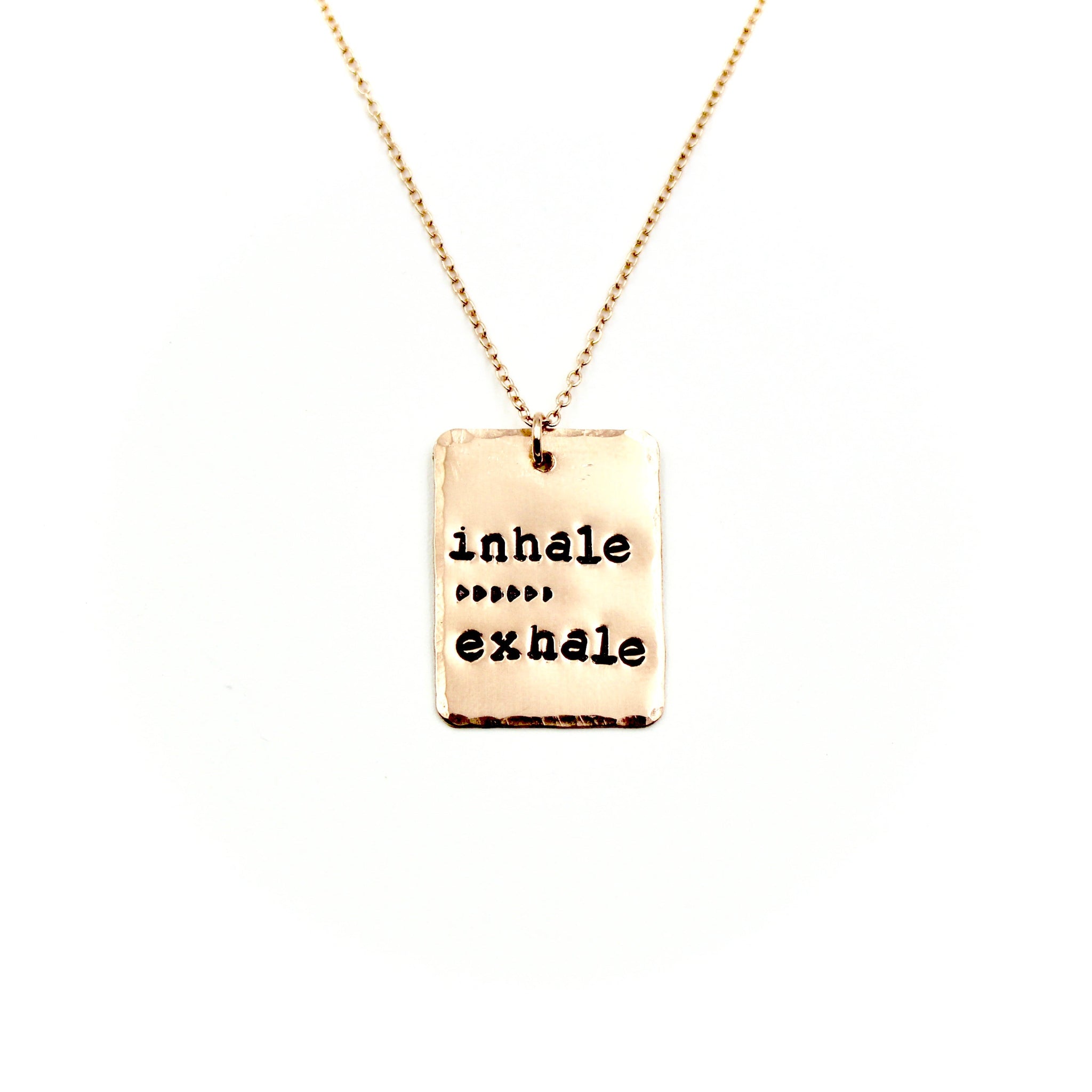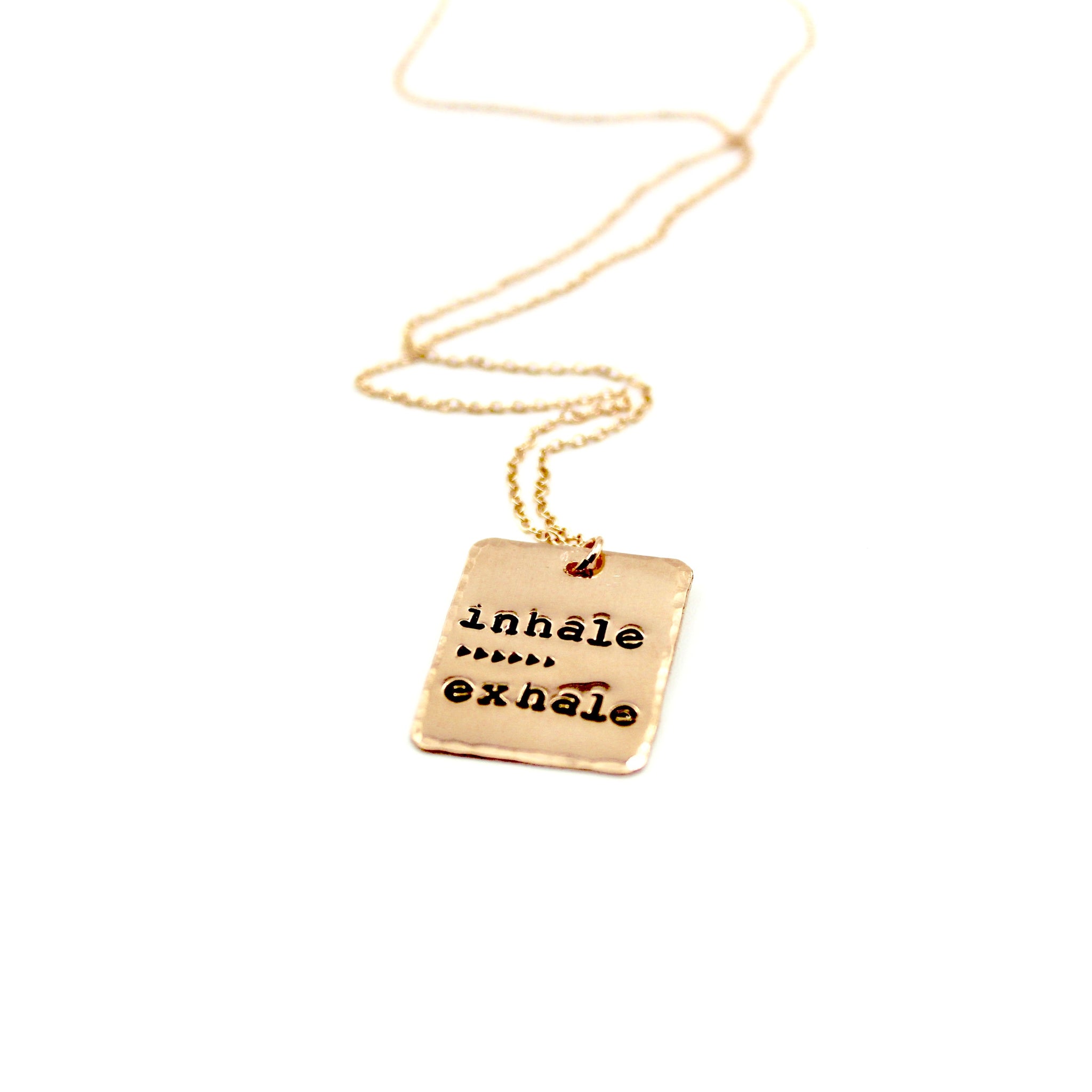 This necklace features a simple charm that's hand-stamped with inhale exhale.
