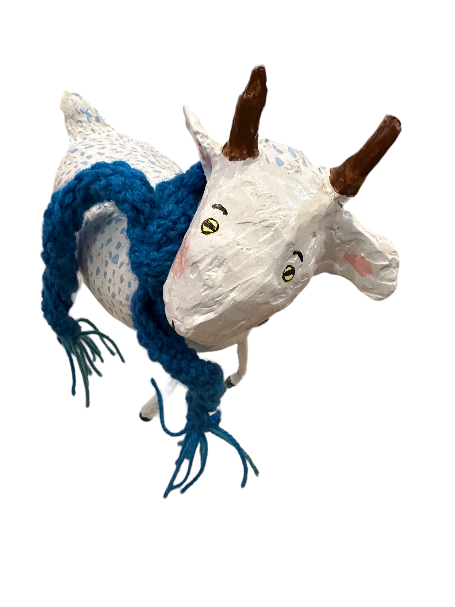Whimsical goat with blue scarf. Approximately 8" tall x 8" long. Handmade paper mache with recycled materials.