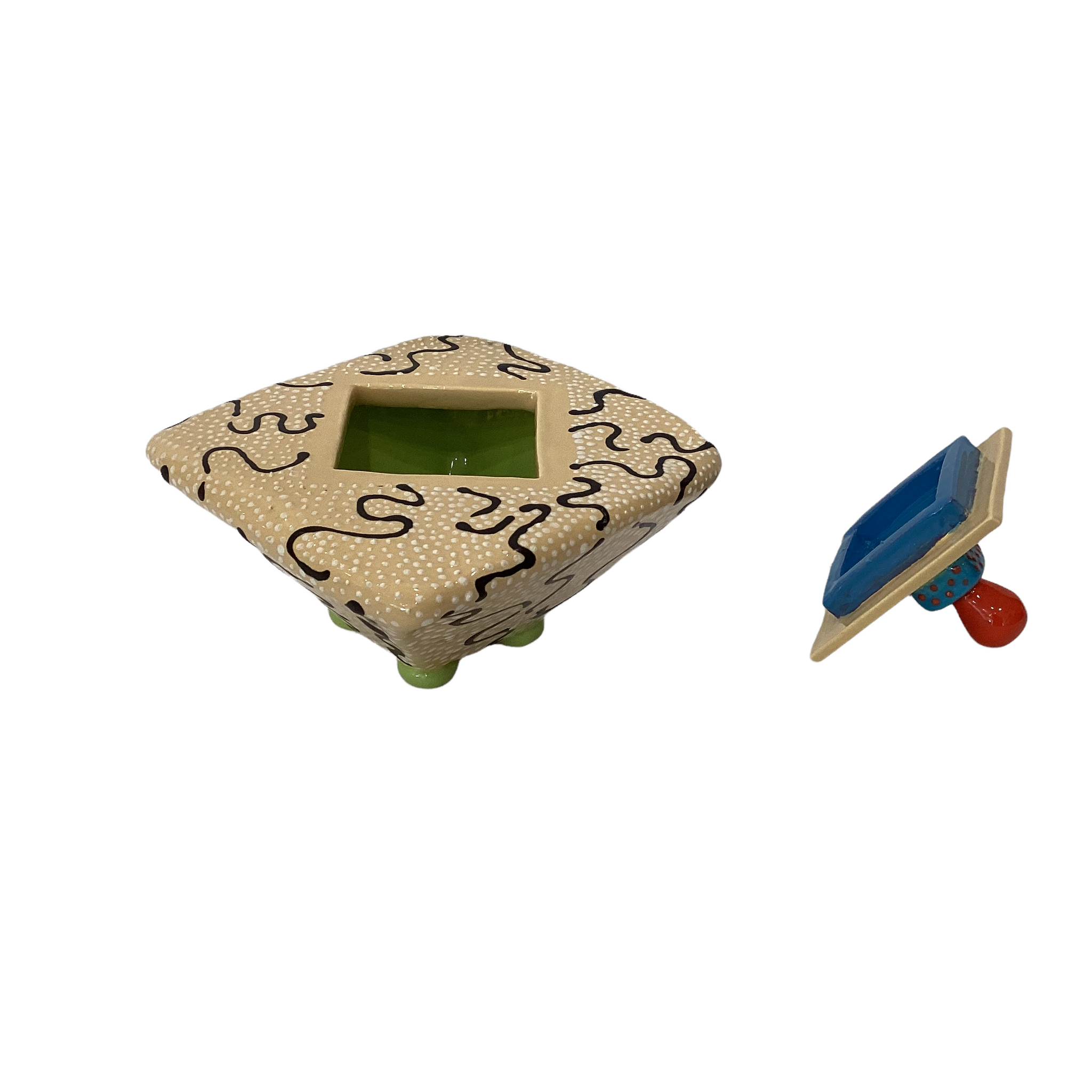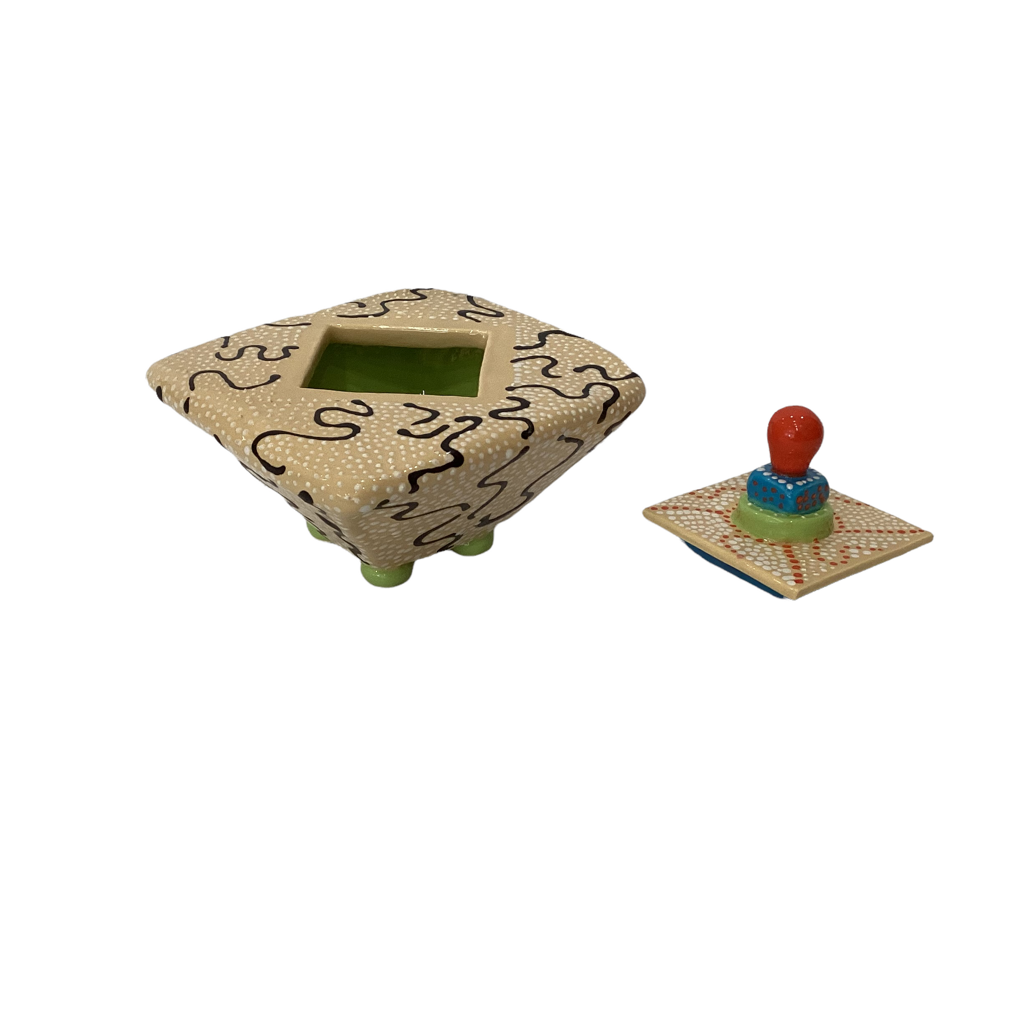 Handbuilt glazed stoneware vessel with lid. Approximately 5” high, 6” square