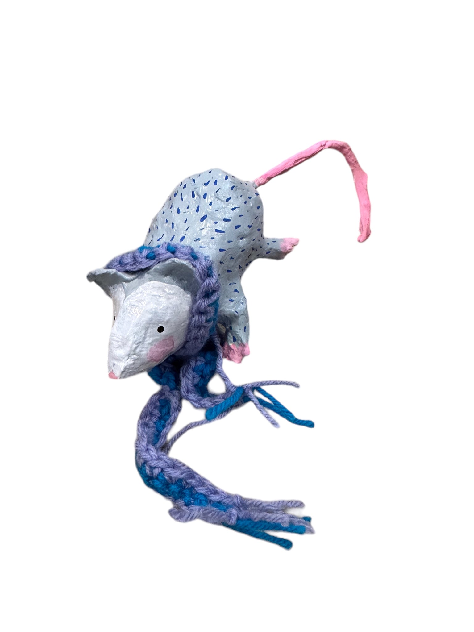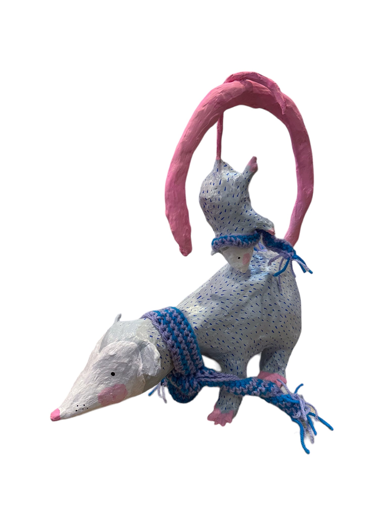 Whimsical possum mom and baby. Approximately 15" tall x 15" deep x 6" wide. Handmade paper mache with recycled materials.