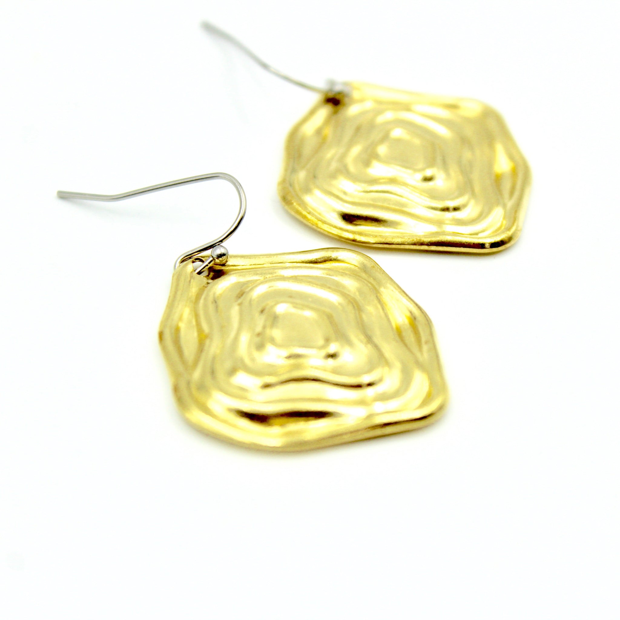 This adorable pair of dangly earrings feature a brass charms that have an interesting liquid molten appearance. Includes rubber backs.