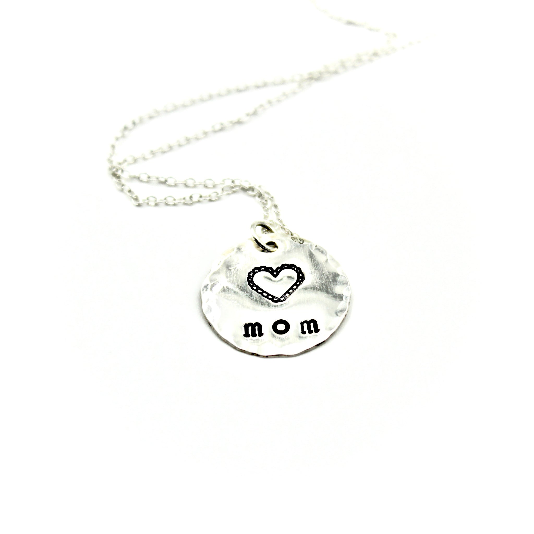 This necklace features a round charm that is hand-stamped with mom and a little lace heart.