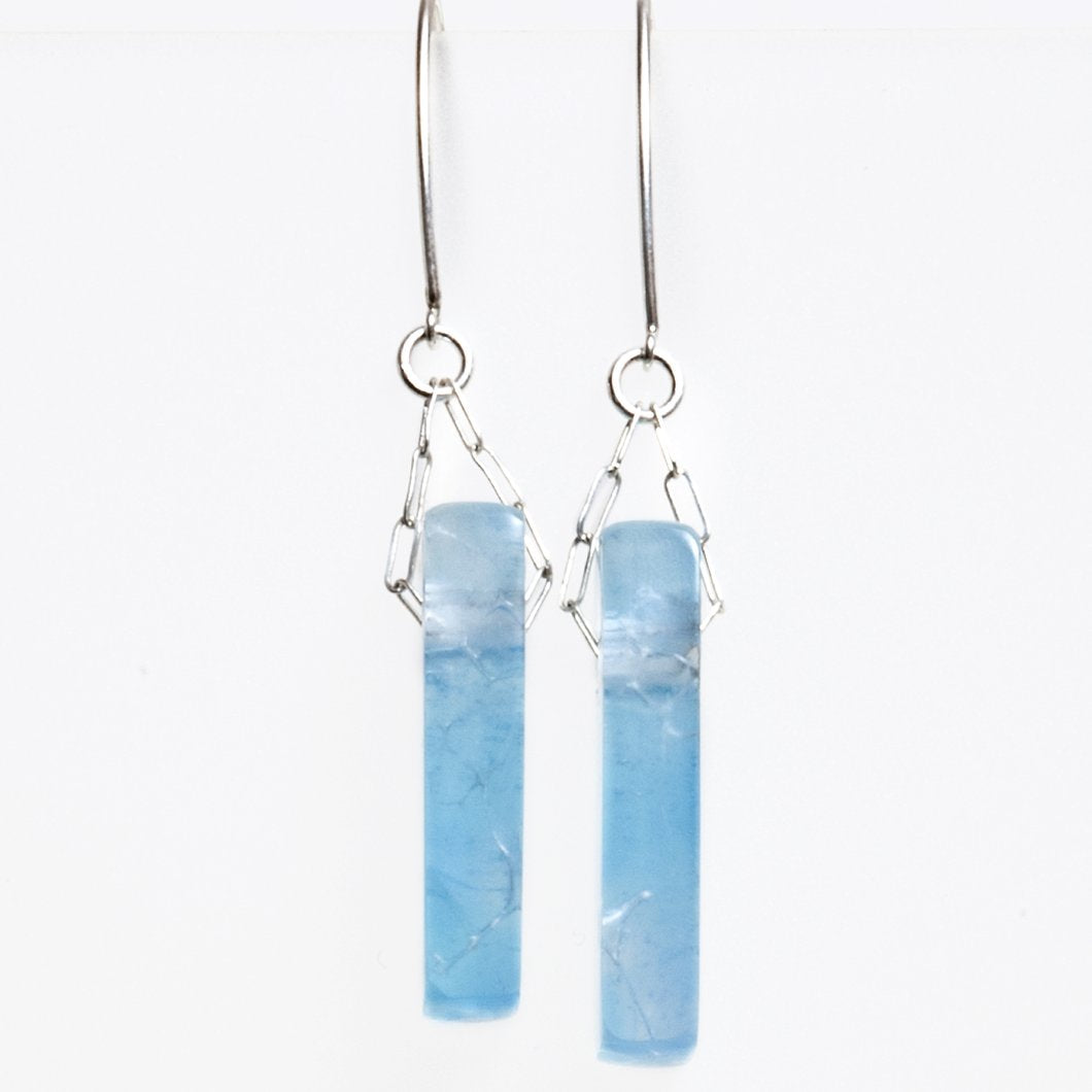 Like em' on your neck, you will love them on your ears! Post-consumer bottles are collected from restaurants, friends, and the occasional dumpster, then cut and fired to create beautiful and unique mosaic glass pieces. Finished with sterling silver boomerang ear wires. Glass is approximately 1 inch long by .5 inches wide.