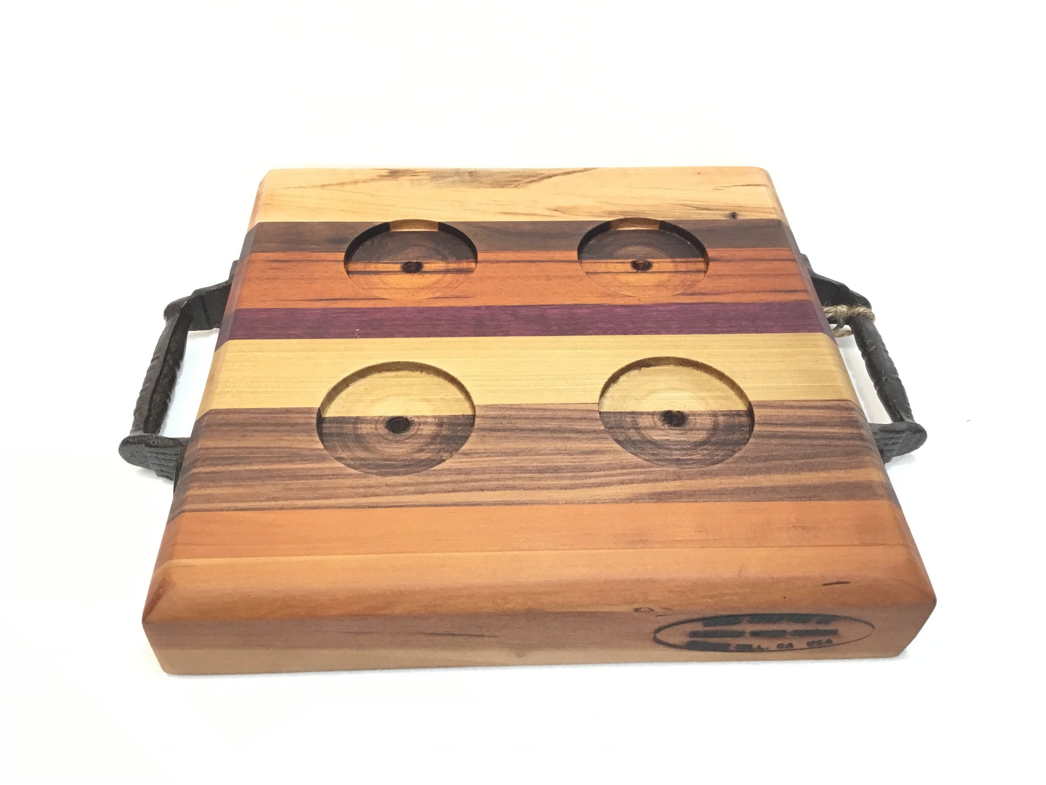 Handcrafted all-natural hardwoods. No stains or dyes used. Hand wash with mild soapy water. Oil as needed with food safe oil (e.g. mineral oil, olive oil, etc.).