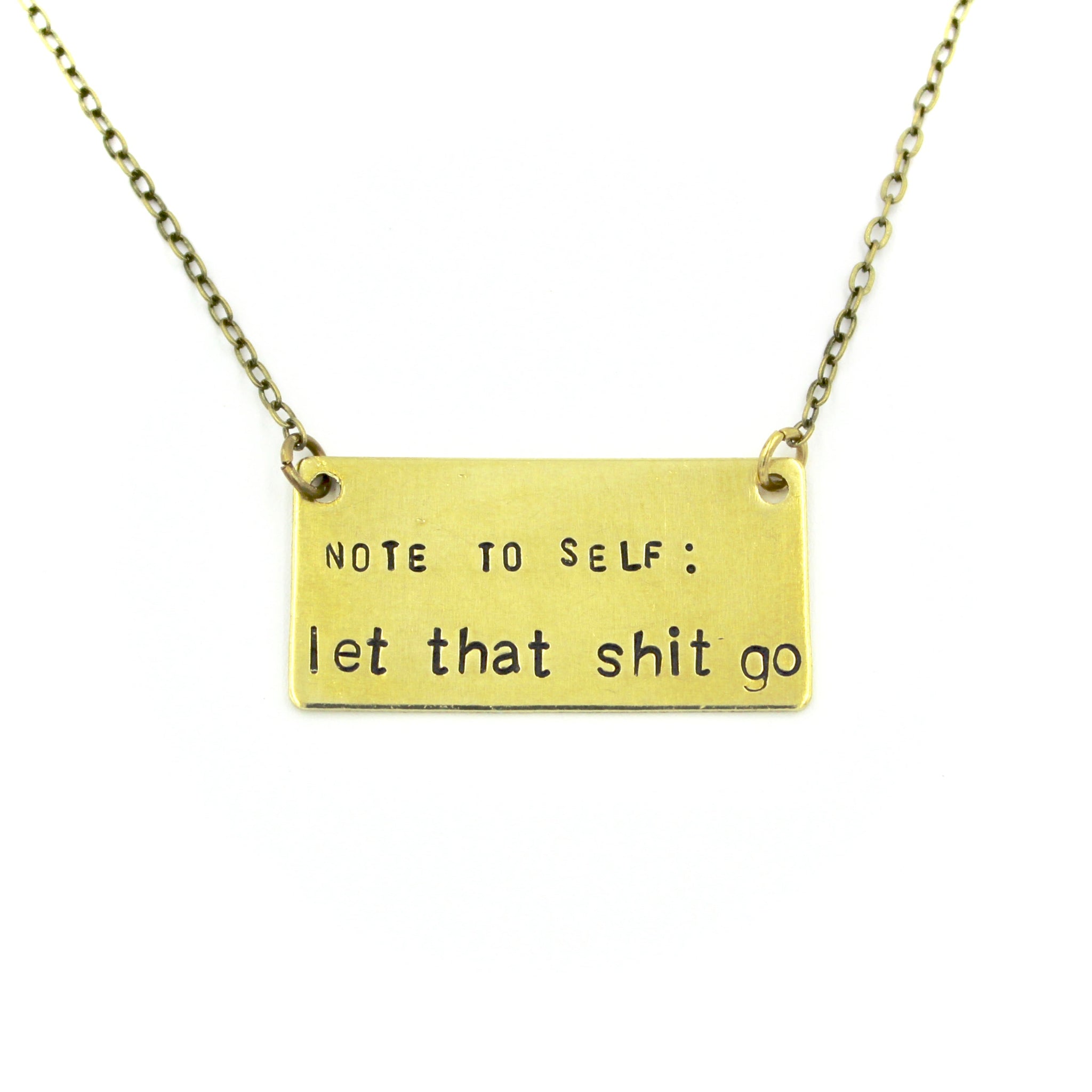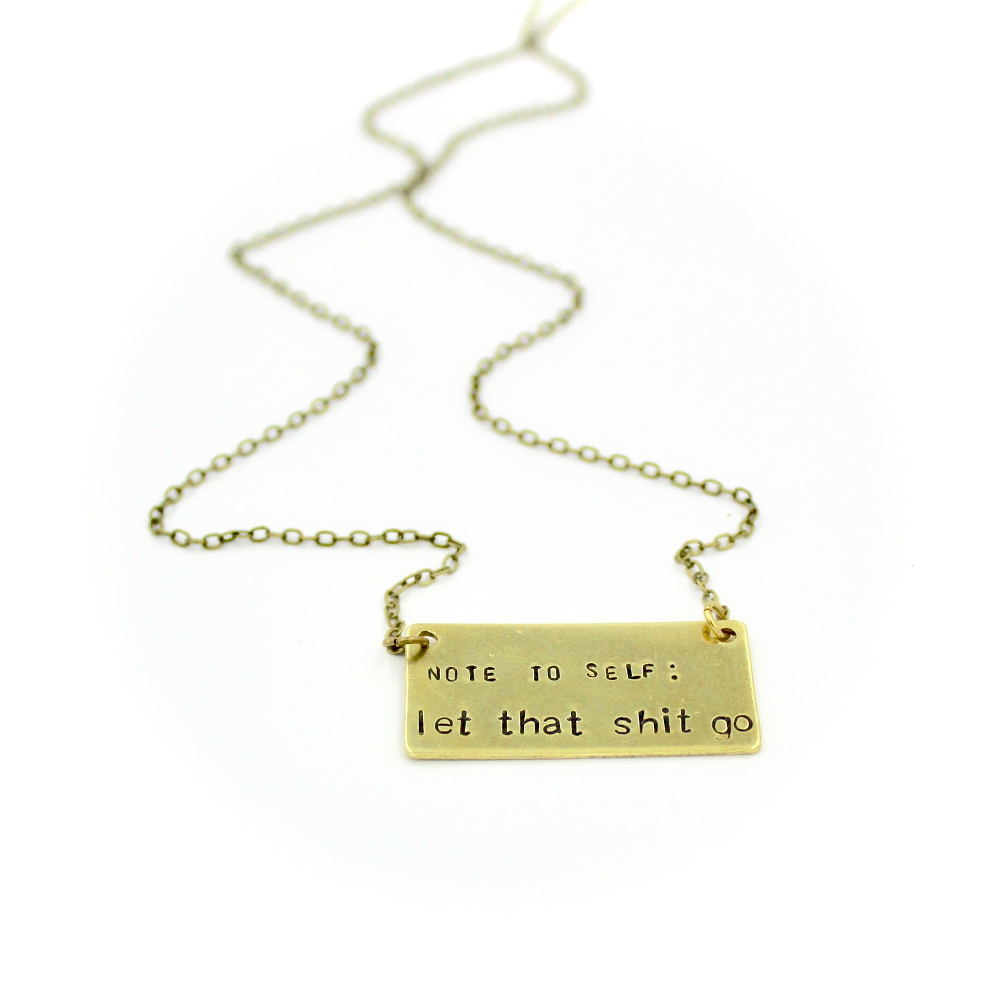 This necklace features a rectangular charm that is hand-stamped with note to self: let that shit go.