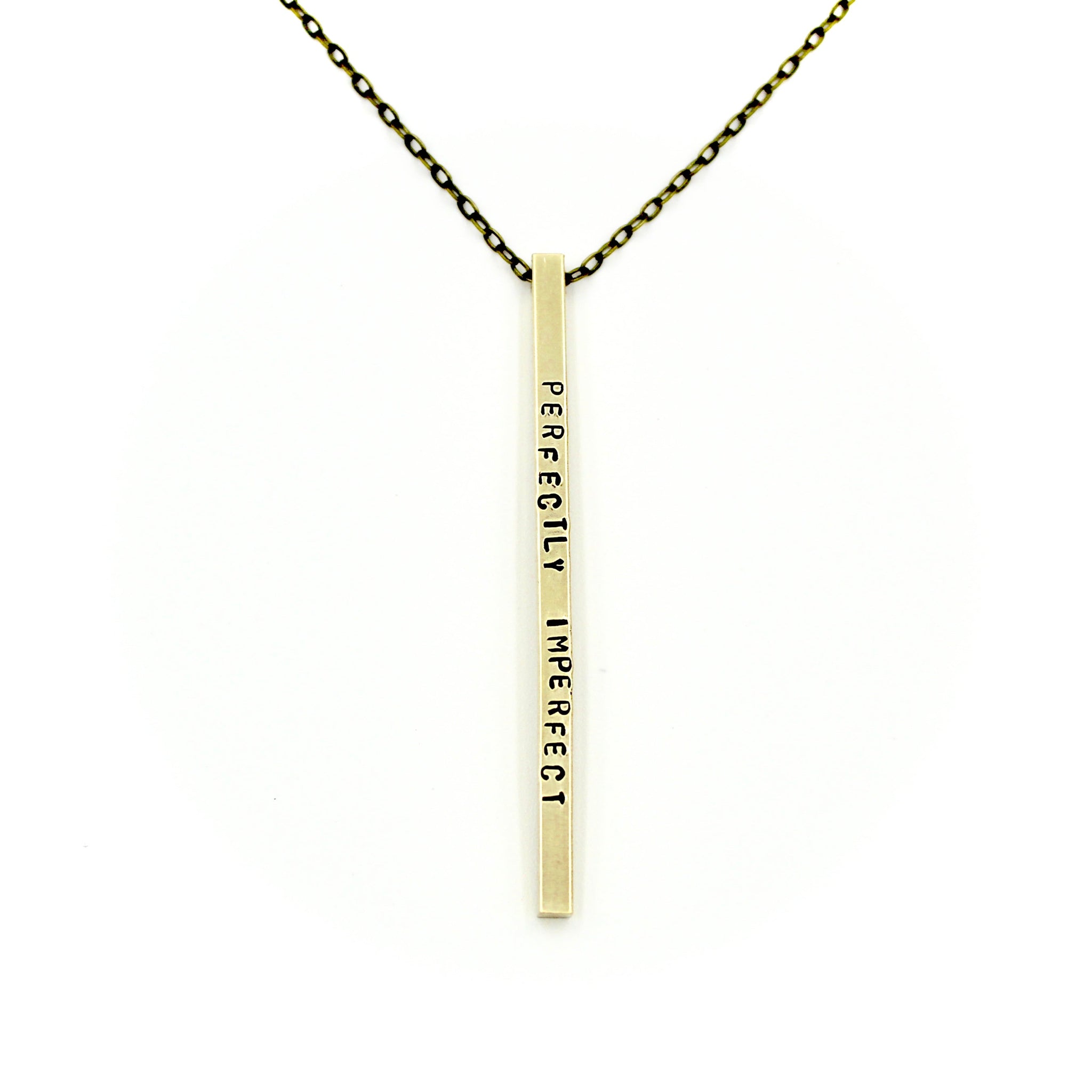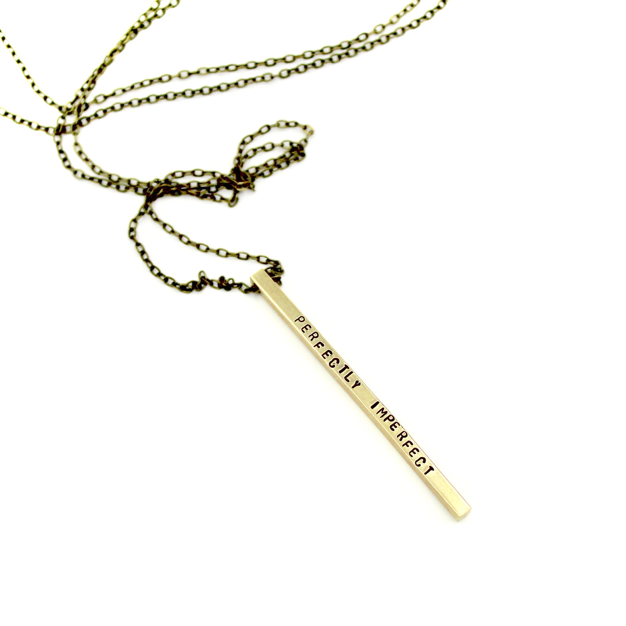 This necklace features a gorgeous brass charm, with perfectly imperfect hand-stamped on it.