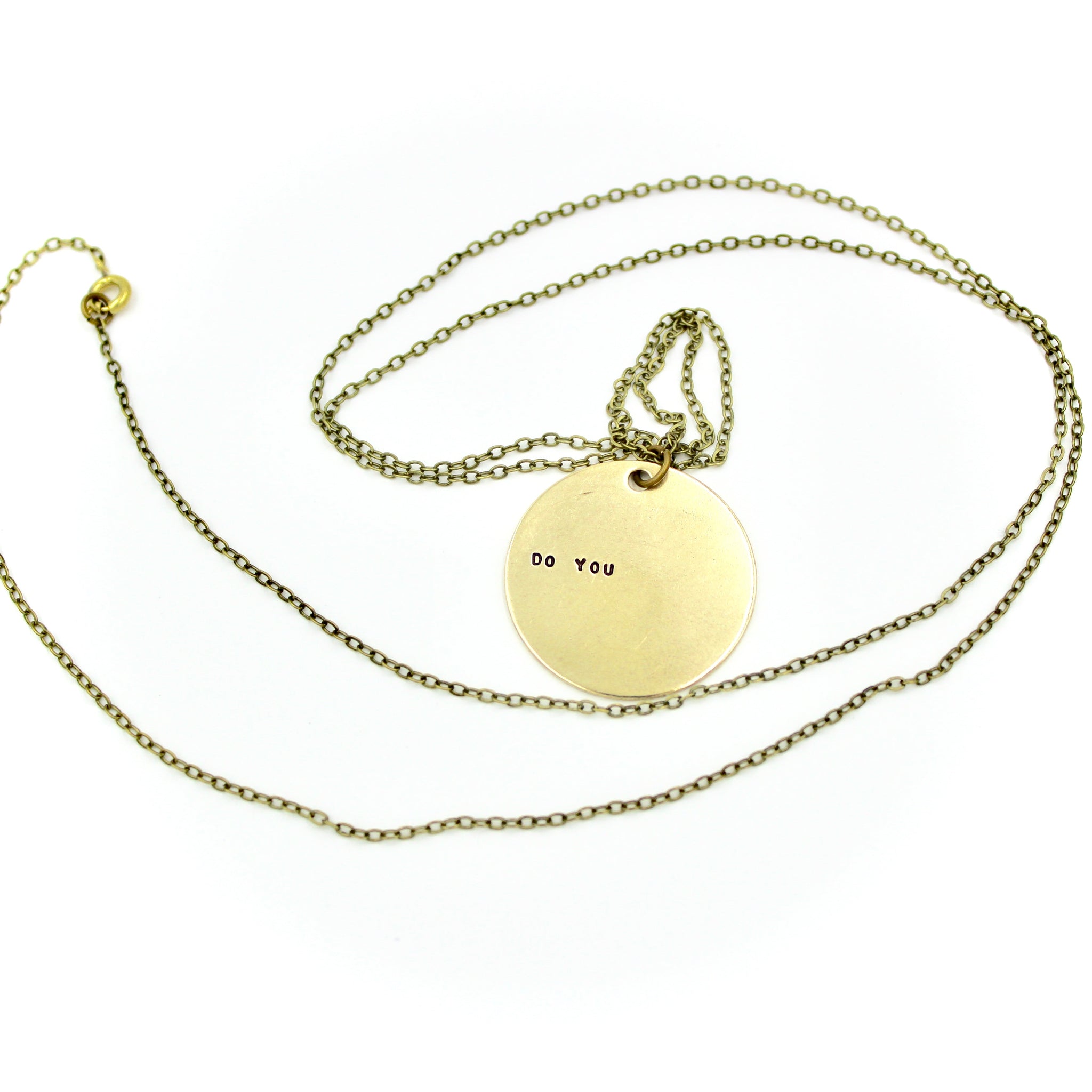 This necklace features a gorgeous brass charm, and is hand-stamped with do you.