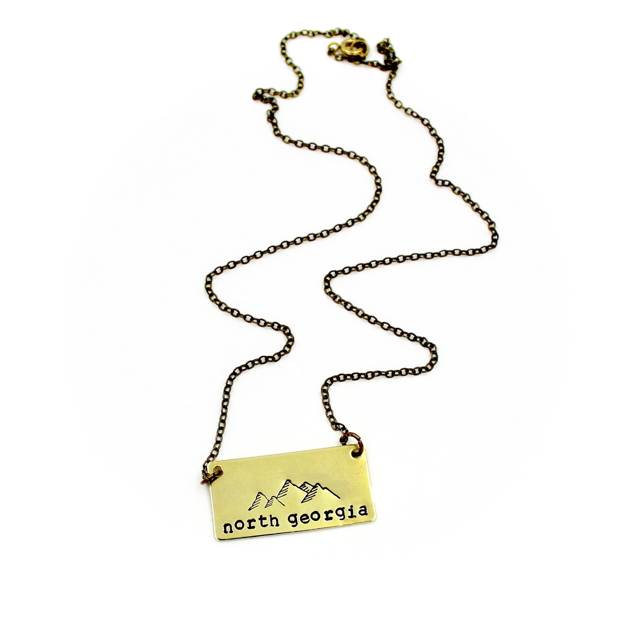 This necklace features a simple charm that's hand-stamped with north georgia and mountains.
