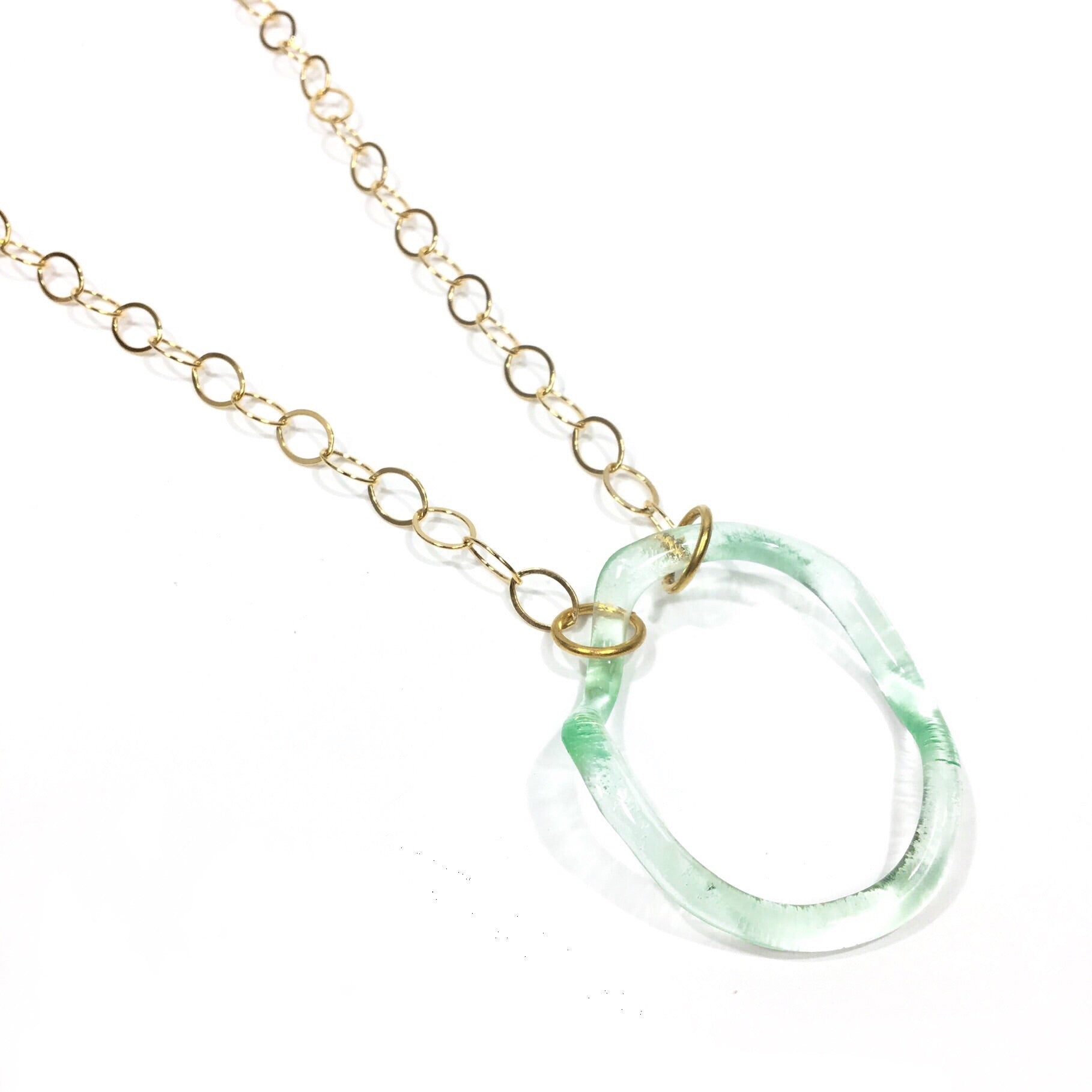 Part ocean, part art, our large wave pendant is striking and unusual. The ruffled glass has movement and texture. Largest piece of glass will be approximately 3 inches of aqua glass cut from a sake bottle, you can choose your two inner colors. 18 inch sterling silver chain.