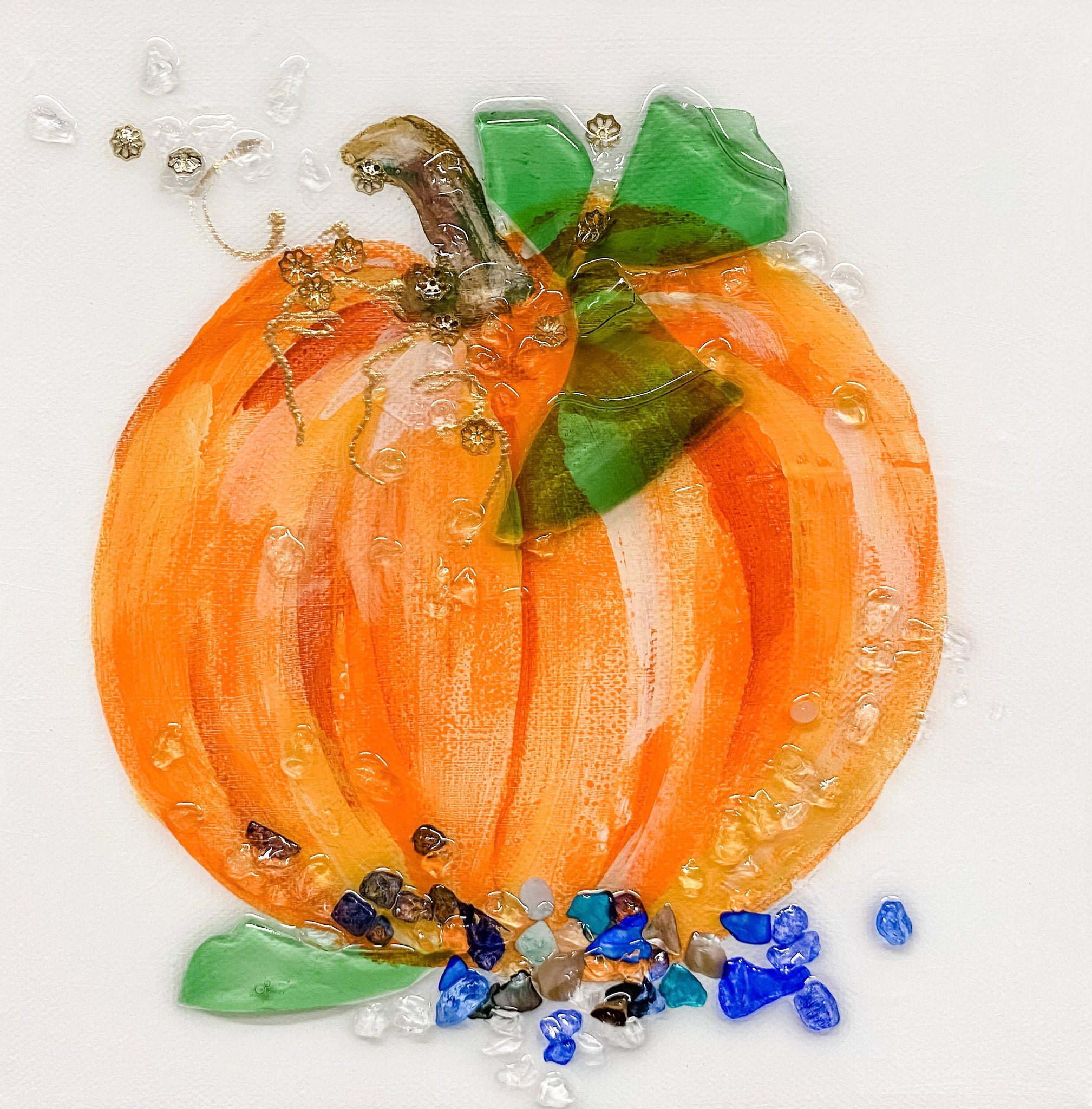 8"x8"x1" White CanvasRecycled Glass, Gold Metal Circles, Painted with Acrylics and Resin