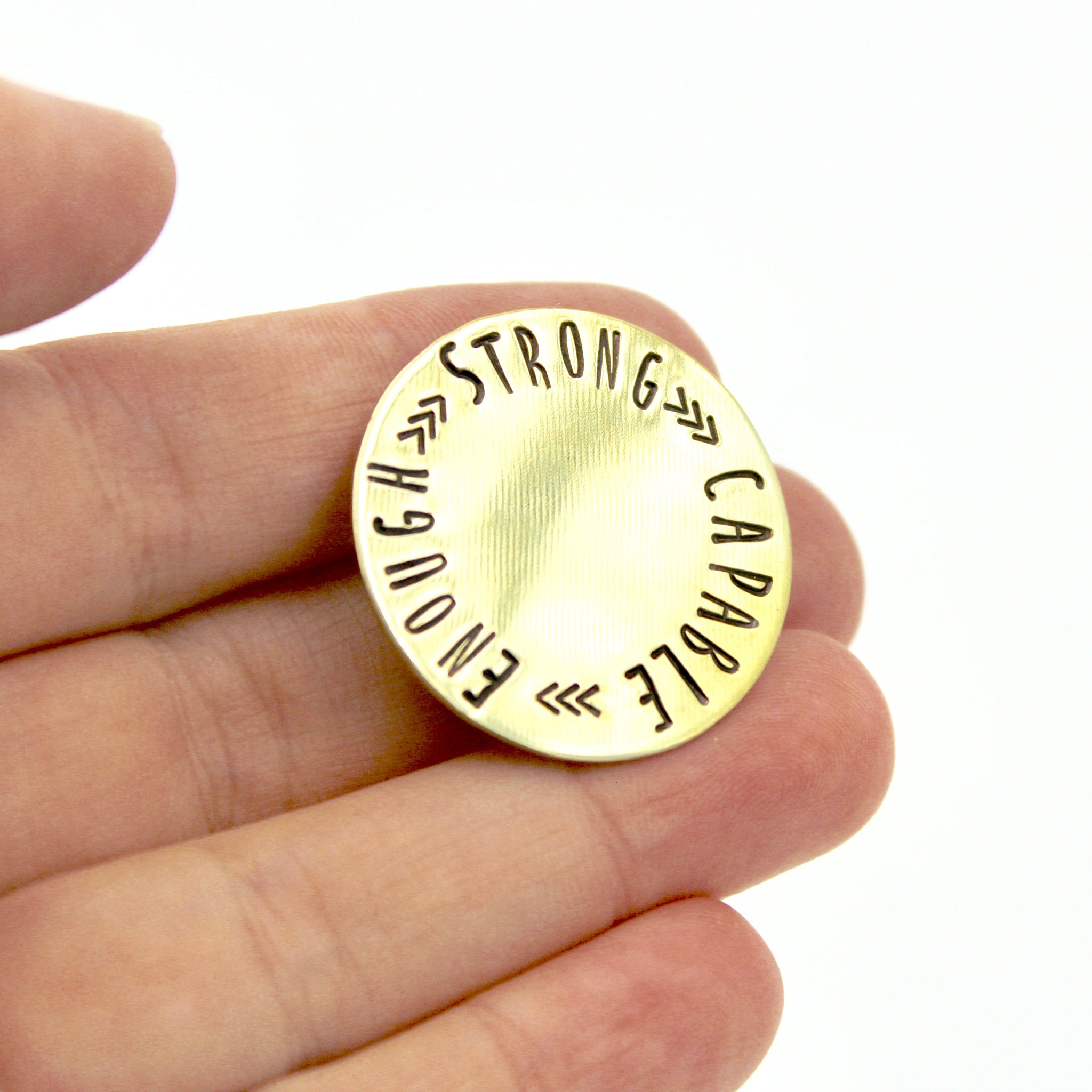 This lapel pin features a thick round shape, what is hand-stamped with a strong, capable, enough.